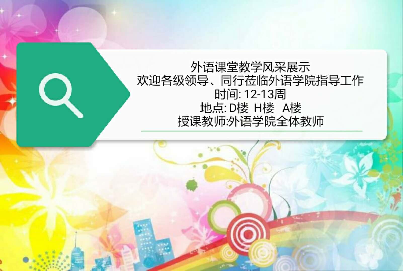 为全面贯彻党和国家的教育方针和政策,积极落实学校教育教学检查和督导工作,搭建外语教师锻炼、展示、交流学习的平台,提升外语教师的专业发展和教育教学质量,外语学院于12周-13周举办了外语课堂教学风采展示暨校校交流活动。