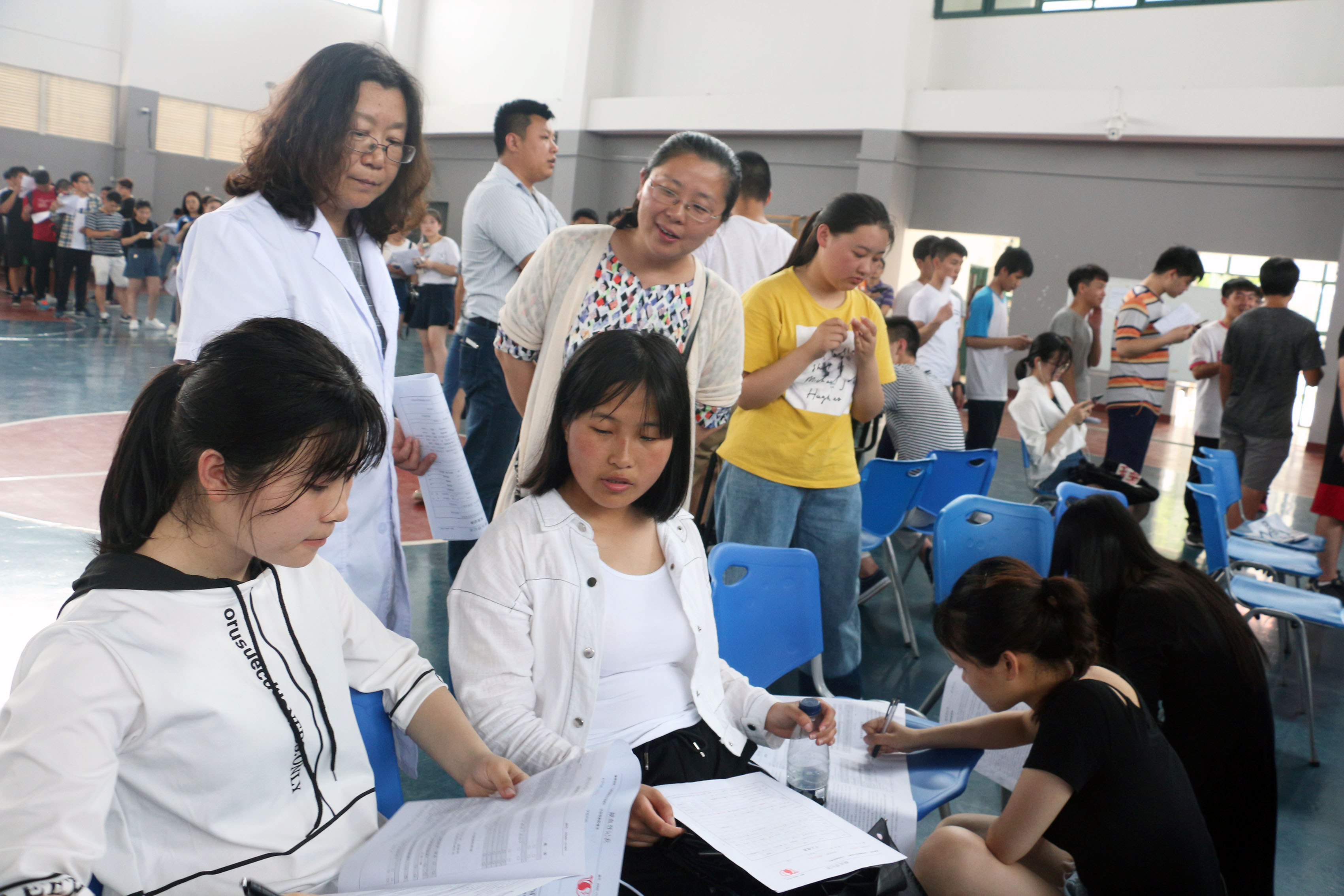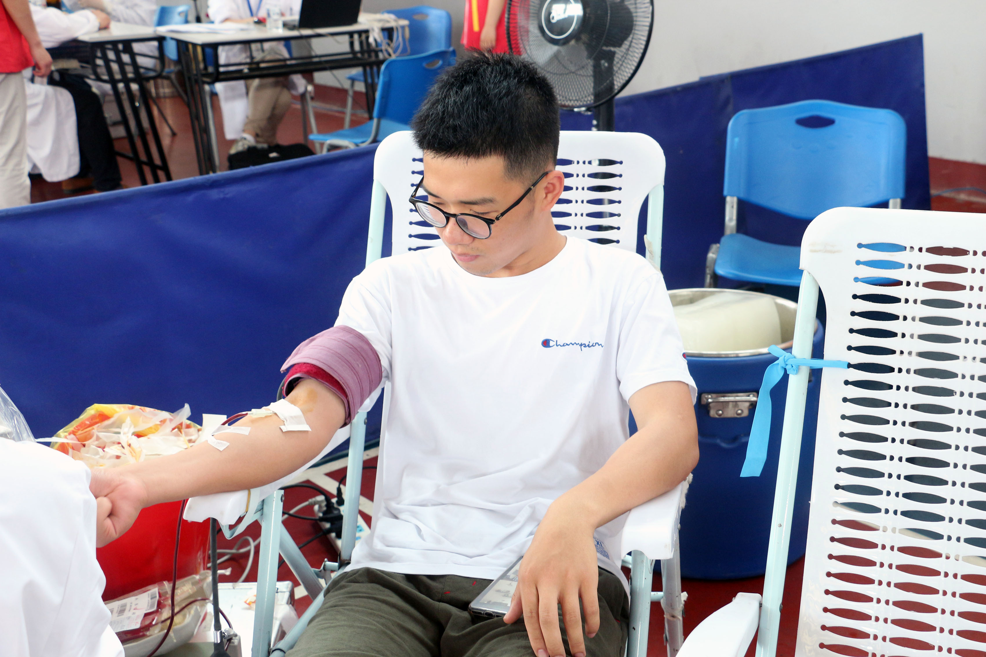 献血当日,外语学院的献血同学便早早的来到室内运动场排队、填表、验血、采血。