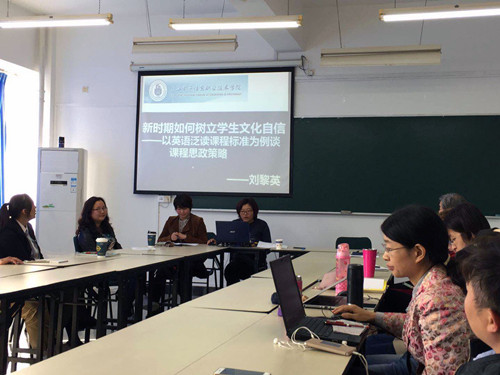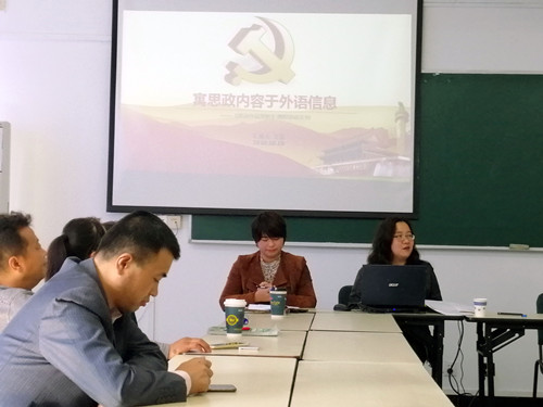 立德树人是党和国家赋予高校的根本任务。为贯彻落实好中央《关于加强和改进新形势下高校思想政治工作的意见》,我院两党支部积极引领党员教师把思想价值引领贯穿教育教学全过程和各环节,认真开展课程思政,做好教书育人工作,在专业课程中融入思想理论教育和价值引领,切实提高课程思政教育的有效性。两支部的党员老师和入党积极分子进行了积极探索。当天,第一党支部的王磊老师分享了题为“寓思政内容于外语信息——《德语作品赏析》课程思政实例”,王老师以专业课为载体在课内外开展形式多样,内容丰富的教学活动,既育人又育心。第二党支部的刘黎英老师以“新时期如何树立文化自信——以英语泛读课程标准为例谈课程思政策略”为题,为大家讲述了她如何在课程中融入思政教育。刘老师的泛读课程以了解世界遗产名录中的中国遗产,掌握中国自然文化遗产概况为学习目标,培养大学生的文化自信和保护中国自然文化遗产的责任感。虽然我们外语学院的学生学习的是外国语言和外国文化,在构建人类命运体和开展“一带一路”战略背景下,讲好中国故事,传播好中国声音是外语学子厚望在肩的光荣使命。