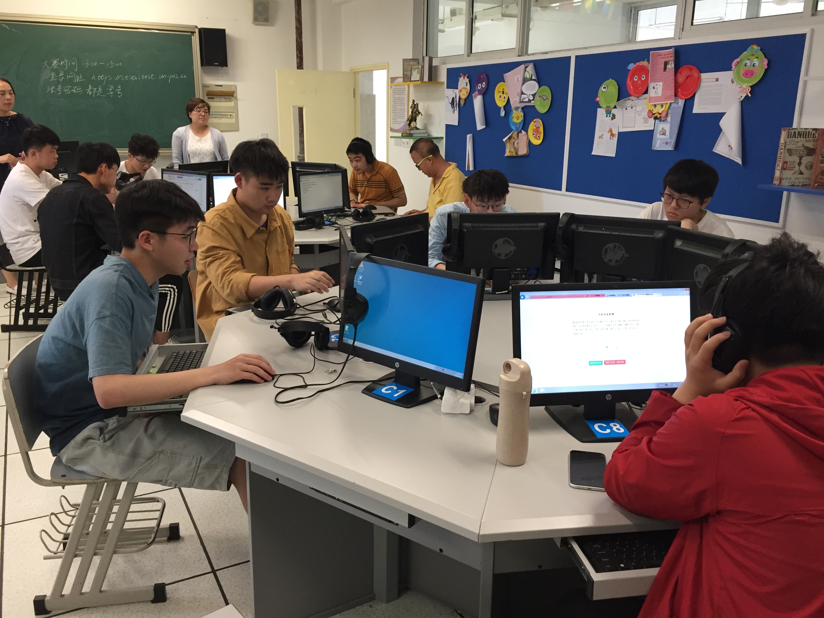 纪念新中国成立70年,展望教育现代化,加快教育信息化。深入贯彻全国教育大会讲话精神和《教育信息化2.0行动计划》,推动我校信息技术与教育的深度融合,2019年5月29日,由外语学院主办,外研社I Test平台协办的第十届学生职业技能大赛——“英语在线写作”大赛校级决赛在H楼401,403语言实验室举行。共计35名选手通过初赛的激烈角逐,成功进入了此次决赛。大赛期间,外语学院专业主任陈丽君老师、李俊霞老师、张蕾老师出席了本次活动。