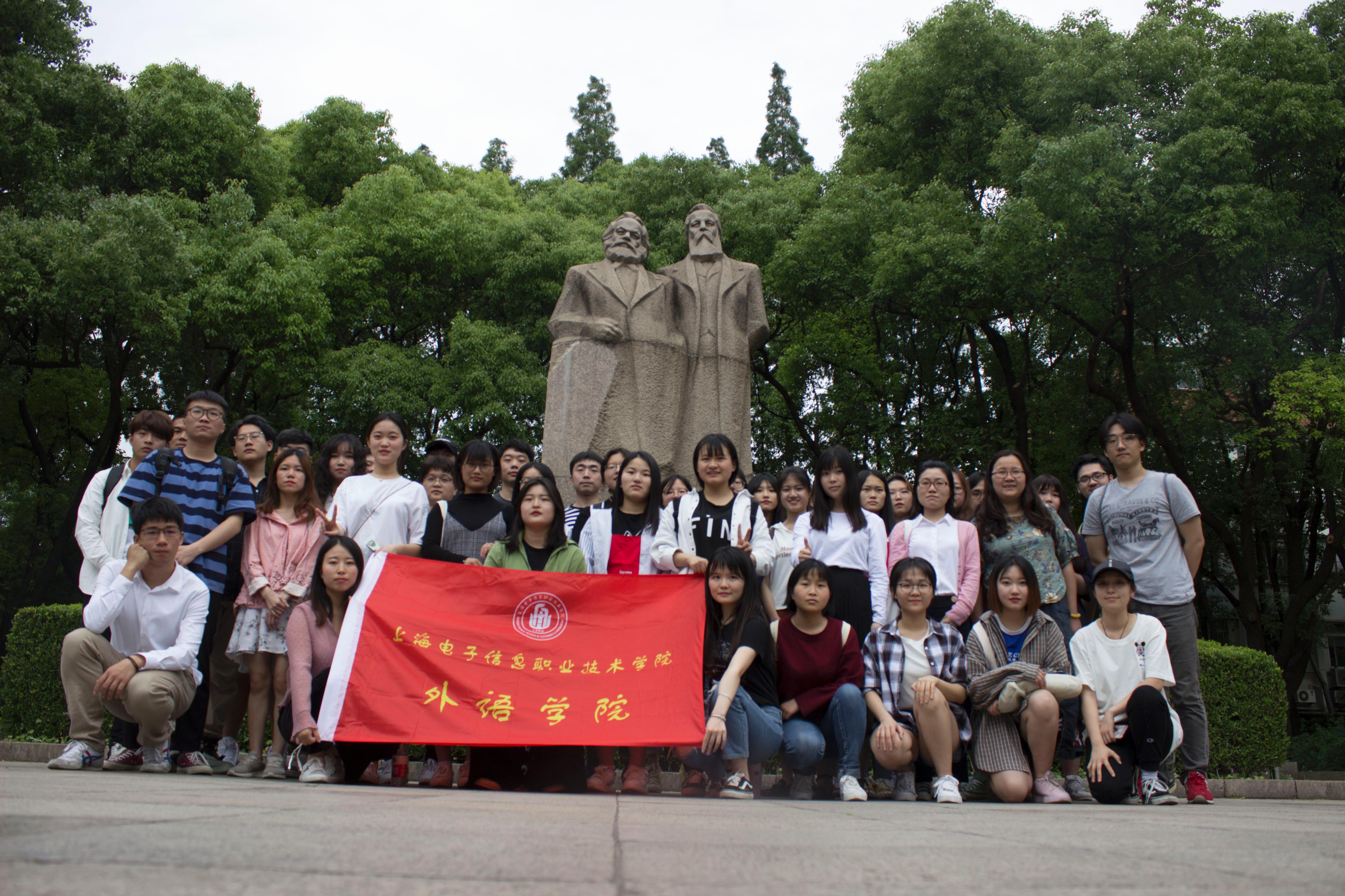 5月30日,外语学院应用德语17级全体学生在德语系王磊老师、顾婷婷老师和钱超毅老师的组织和带领下赴往兴业路76号和复兴公园马克思恩格斯雕像前开展德语实践教学活动,参观一大会址,共同重温德语原版《共产党宣言》。