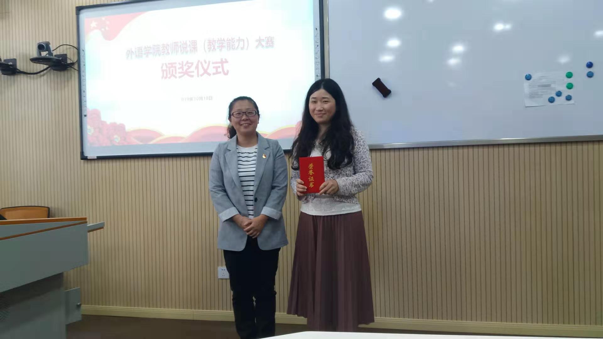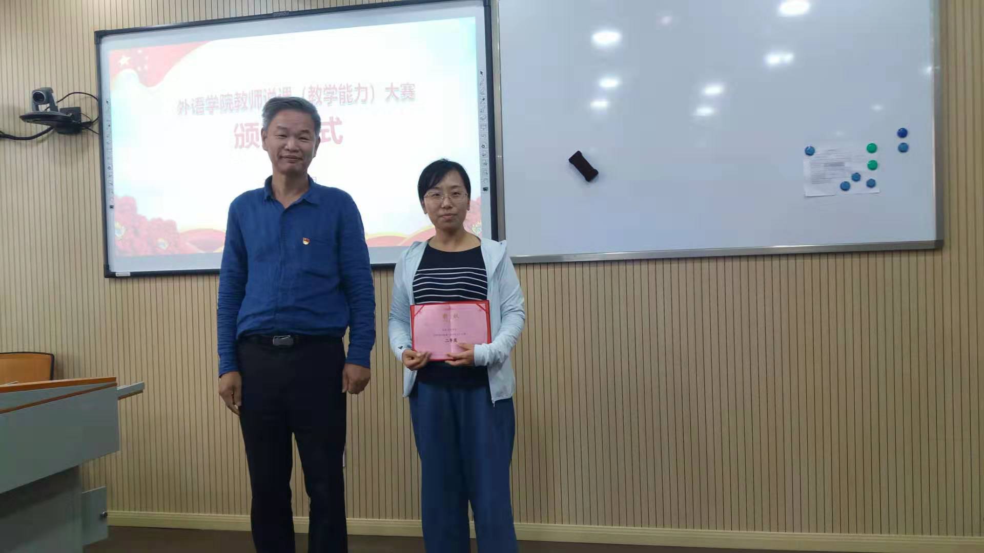 大会第三部分是外语学院教师说课(教学能力)大赛的颁奖仪式,肖院长和吴书记对获奖教师进行颁奖,英语系徐晓莉老师荣获外语学院说课大赛一等奖。