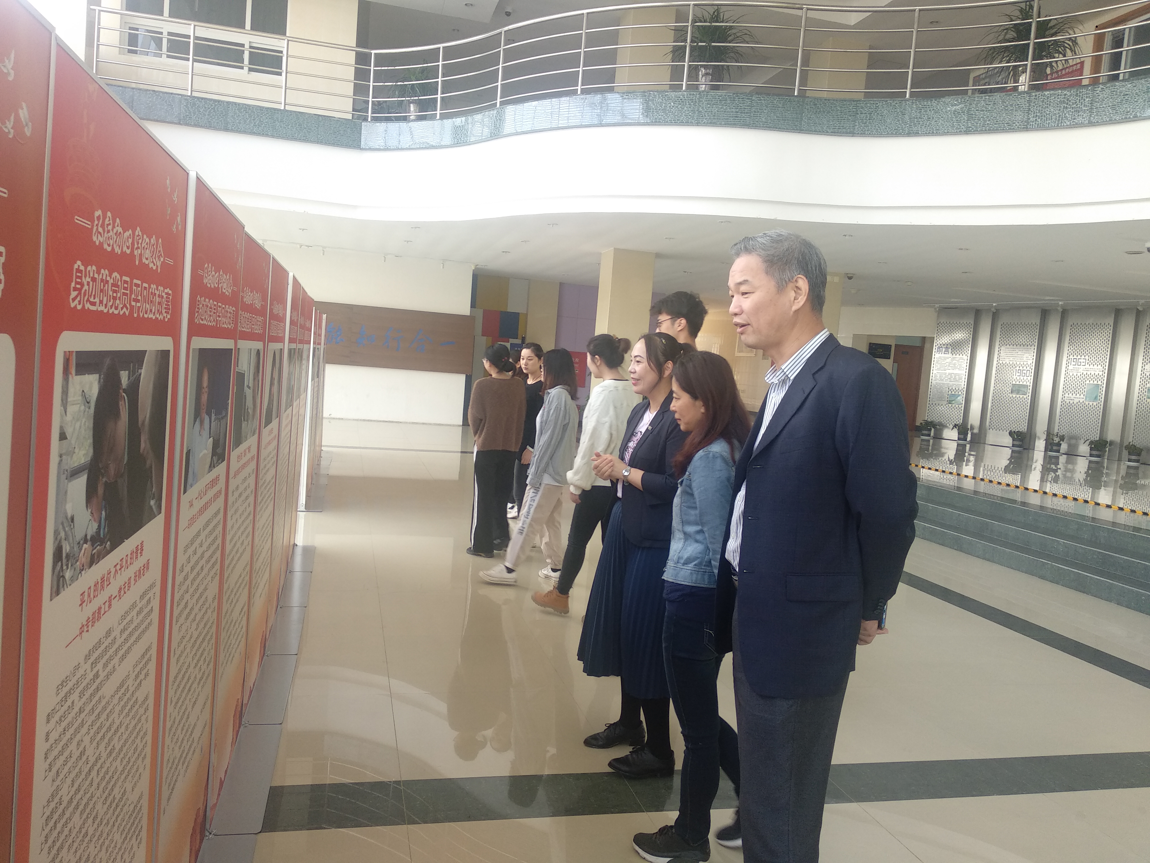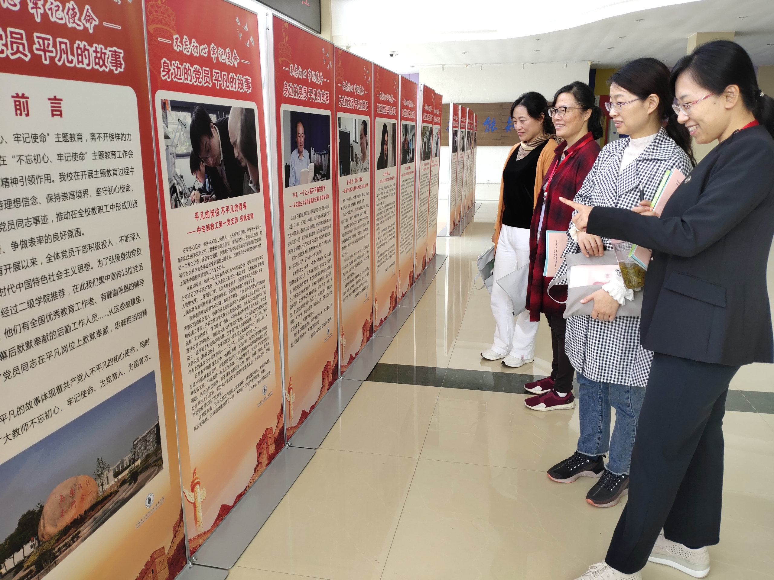 2019年10月25日,外语学院组织全体教师们前往B楼大厅参观“不忘初心、牢记使命”主题教育“身边的党员,平凡的故事”展。