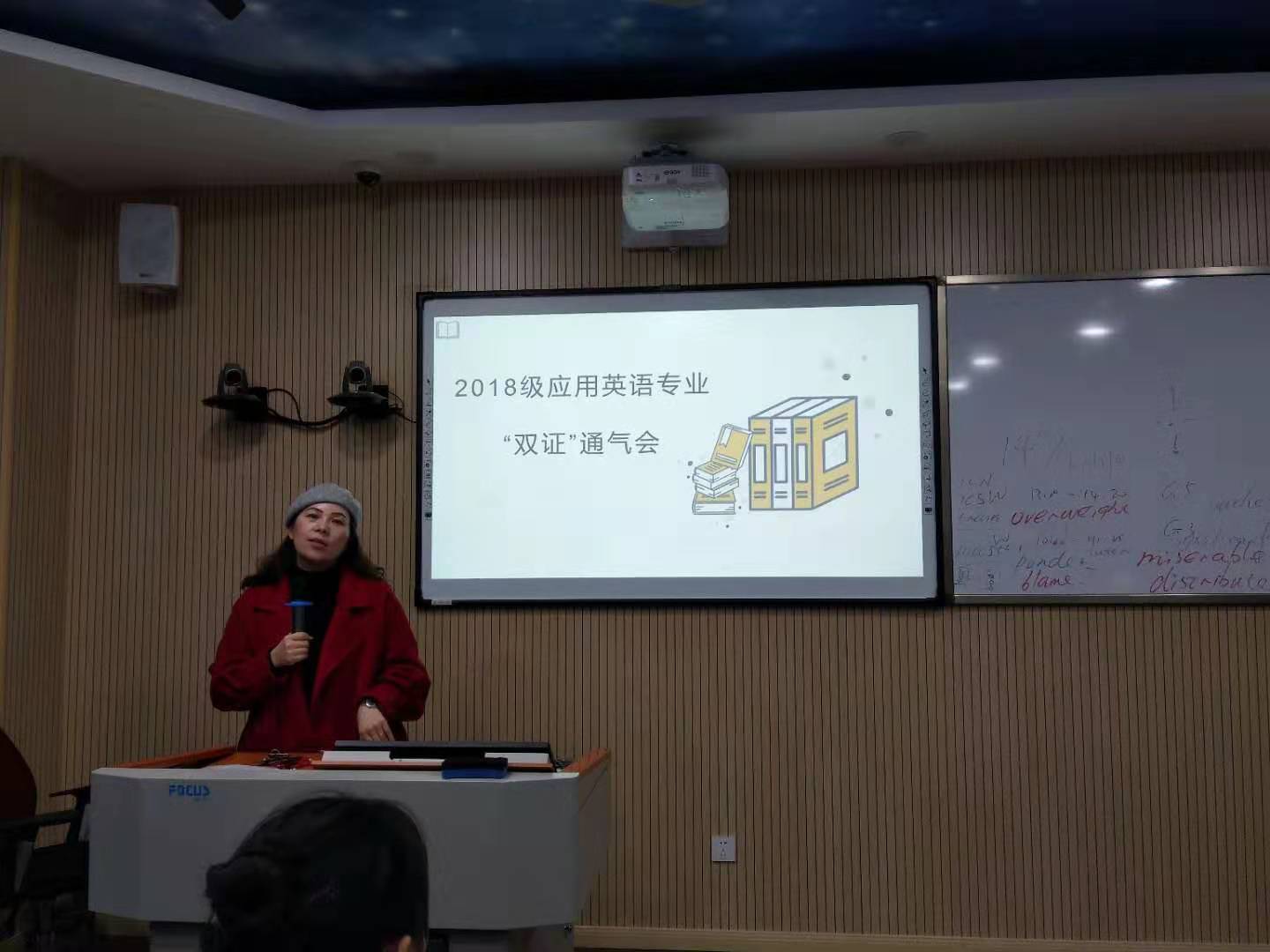 2019年12月18日,英语系召开了2018级应用英语专业“双证通气会”。此次会议由英语系主任陈丽君主持,2018级应用英语专业学生参加了此次会议。