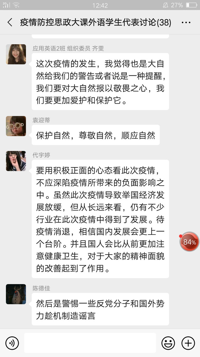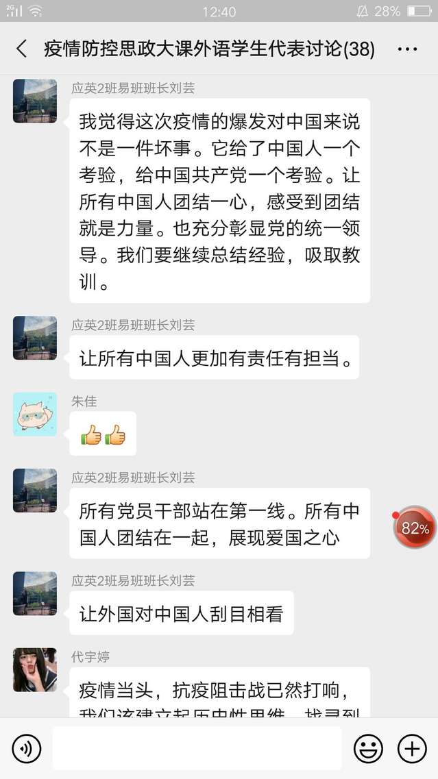 当晚19:00,外语学院组织马克思主义学院朱佳老师、辅导员老师、教师代表和学生代表共计38人的讨论小组,对本次思政大课进行学习和讨论。朱佳老师通过谈听课体会、抗疫问题交流和自由讨论的方式引导学生展开讨论,学生们积极参与讨论,他们从党中央的积极应对举措、尊重自然、敬畏生命等各种角度谈论看法,讨论进行了1个小时,同学们收获颇丰。