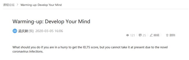 抗疫特殊时期,外语学院按照学校要求,坚持以学生为主体组织线上教学,精心打磨课程。在授课方式上,做到线上与线下相结合——线上聚焦高密度、短时长的讲授和指导,线下促进学生自主学习与研究性学习。孟庆尉老师的《英语写作》课程调整授课方式,教师从“给予”到“激发”、学生从“被动”到“主动”。在留学申请书写作项目中,教师以“新冠肺炎疫情背景下,学生如何联系学校拿到雅思成绩”为话题,不但帮助学生做到学以致用,更是把爱国主义教育、理想信念教育融于其中,为身处疫情防控下的学生们答疑解惑、振奋精神。课程注重培养学生主动思考和解决问题的能力,为疫情结束后的学习做好准备。