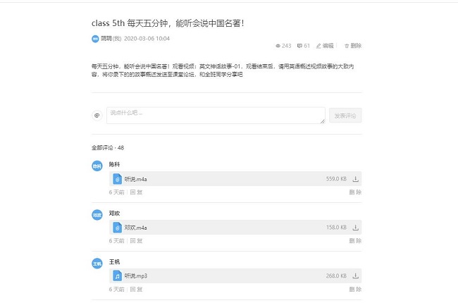课堂教学上注意节奏的把控,除了常规的课后作业外,还注重对学生的长短周期项目训练,如每日计划、每周学习等等。阴玥老师的《英语听说》课程根据学生特点设置“每天五分钟,能听会说中国名著”版块;《英语精读》课程提出了了每周课后观看“Hello China 英语学习中国文化”的要求,增强了学生的体验感,激发了情感共鸣,培养了青年学生的爱国主义情怀。