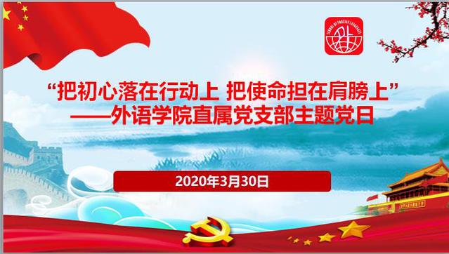 为贯彻落实新冠肺炎疫情发生以来习近平总书记重要指示精神,发扬外语学院直属党支部全体党员在疫情防控工作中冲锋在前、顽强拼搏的精神,外语学院党员教师响应上级“不停学、不停教”号召,投身在线教学工作;管理人员积极做好辅助工作,为教学一线服务。3月30日,外语学院直属党支部开展“把初心落在行动上、把使命担在肩膀上”主题党日活动。通过活动,激励全体党员在工作中走在前列、勇挑重担,进一步发挥先锋模范作用,让党旗在疫情防控和教育教学第一线高高飘扬。