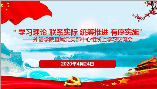4月24日,外语学院直属党支部召开中心组成员线上学习会议,重点学习贯彻习近平总书记2月23日在统筹推进新冠肺炎疫情防控和经济社会发展工作部署会议上的重要讲话精神,同时就学院近期重要工作开展交流,对下阶段任务进行部署。会议由外语学院直属党支部书记吴亚人主持。