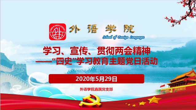 5月29日下午,外语学院直属党支部结合时事形势,开展以学习宣传全国“两会”精神、了解“两会”历史知识为主要内容的“四史”学习教育主题党日活动,学院27名党员同志在线参加了此次主题党日活动。