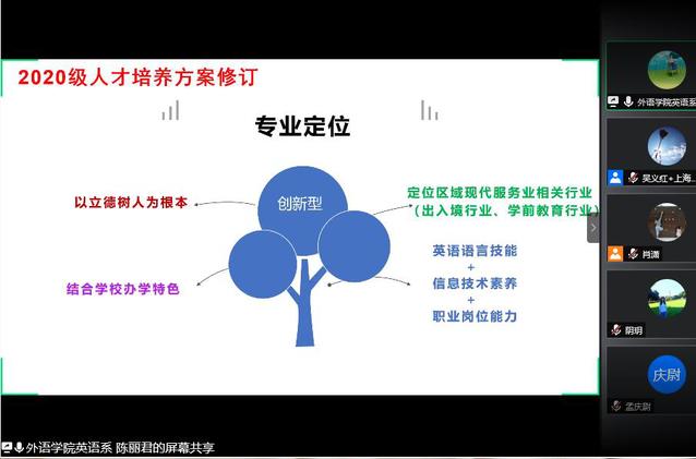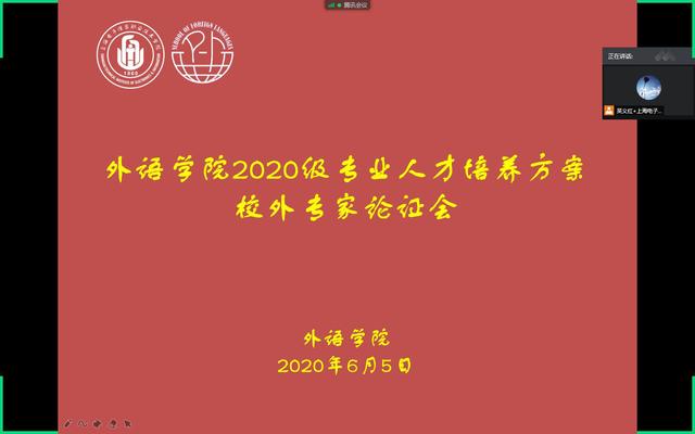 为进一步加强应用德语、应用英语专业建设,提高人才培养质量,2020年6月5日、6月6日,外语学院以线上会议方式召开了2020级应用德语、应用德语专业人才(五年一贯制)、应用英语培养方案校外专家论证会。本次会议邀请了上海城建机电专业谭艺教授、上海济光职业教育学院基础部主任腾永青教授、伊顿国际幼儿园总监田润枝老师、天津中德应用技术大学德西日语系主任宛立群教授、北京青年政治学院教研室主任谢金艳教授、上海汇展信息科技有限公司项目经理杨雄杰、上海奇思幼儿园园长岳鸣婕老师、北京双雄出入境公司高级经理张立娟老师、上海行建职业技术学院纵瑞昆教授、上海译文出版社庄雯老师等校外专家。