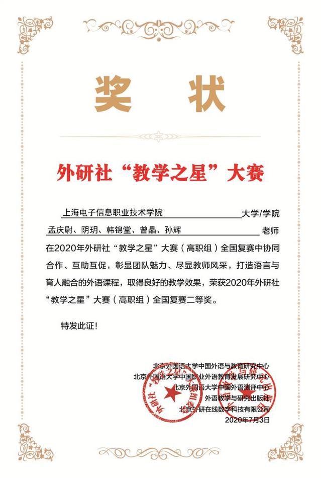 2020年6月,外语学院英语系孟庆尉、阴玥、孙辉、曾晶、韩锦堂五位老师组成参赛团队参加由教育部高等学校外语教学指导委员会、教育部高等学校英语专业教学指导分委会、北京外国语大学中国外语测评中心和外语教学与研究出版社共同举办的2020年外研社“教学之星”大赛,荣获大赛(高职组)全国复赛二等奖。