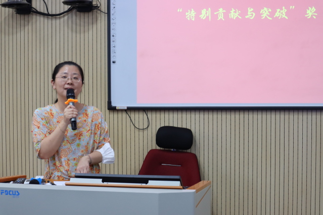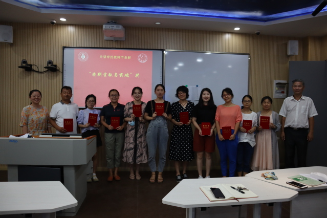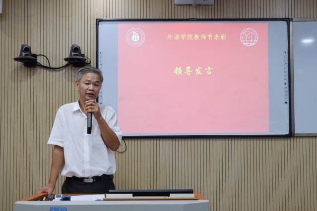 肖潇院长为大会致开幕词,并代表学院热烈欢迎新进教师加入外语学院。会上肖潇院长宣布了学院教师节表彰名单,英语系系主任陈丽君、德语系系主任王磊、公共英语系系主任李俊霞等25名教师分别获得了特别贡献与突破奖(获奖教师共24人)、教学能力大赛奖(获奖教师共15人)、学生技能大赛指导教师奖(获奖教师共9人)以及教学科研奖(获奖教师共13人)共计61个奖项。学院党支部书记吴亚人、副院长邓玉华为获奖教职工颁了奖。
