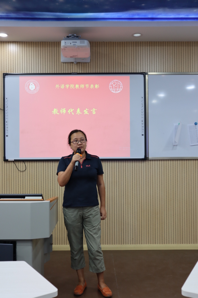 随后获奖教师代表发表了获奖感言。“特别贡献与突破奖”代表陈丽君老师讲述了为建设“双一流”高校以及专业教学资源库所付出的努力,所预见的前景以及所面临的机遇与挑战;王磊老师介绍了德语专业五年一贯制办学的模式特点,预计将实施延长学制,融入工科方向,增加工科课时等举措;教学能力大赛奖获奖教师代表李源老师讲述了参赛过程中的心路历程,以及所获得的成长与感悟;教学能力大赛奖获奖教师代表孟庆尉老师谈到参赛过程中的体会与感受,强调团队合作与坚持的重要性;学生技能大赛指导教师奖教师代表卓宁东老师表达了对学院斩获各项大奖的信心,讲述了为写作课所做努力及所获成果;学生技能大赛指导教师奖获奖教师代表陈丹老师对创新创业工作成果进行了简单介绍,呼吁老师给与学生创业更多科研方面的指导与帮助,充分挖掘学生创新创业潜力;教学科研奖获奖教师代表郑峰老师、孙辉老师也分享了各自在教学及科研工作中的宝贵经验。