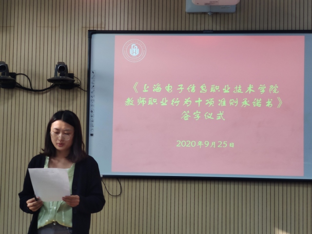 为进一步加强师德师风建设,规范教师职业行为,明确师德底线,塑造“以德树人,为人师表”的良好形象,2020年9月25日,外语学院直属党支部组织2019年6月后入职教职工开展师德师风教育活动暨《上海电子信息职业技术学院教师职业行为十项准则承诺书》签字仪式。