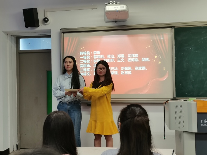 2020年11月19日,上海电子信息职业技术学院外语学院在D209成功举办第一届“朗读大赛”颁奖仪式。本次颁奖仪式由英语系主任陈丽君老师主持,曾晶老师和阴玥老师为19级和20级获奖学生颁奖,19级和20级全体应用英语专业学生均参加了本次颁奖。