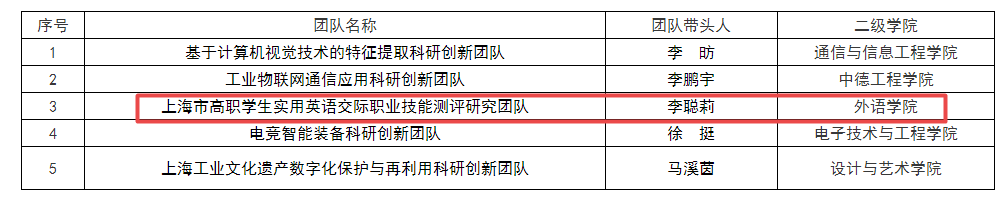 3月23日,根据《关于申报2022年度校级科研创新团队的通知》要求,经外语学院推荐、科研处复审、学校学术委员会审议通过,学校批准,李聪莉老师《上海市高职学生实用英语交际职业技能测评研究团队》获批立项,这是继2019年信息技术与外语课程整合科创团队后又一支外语类团队获校级立项。