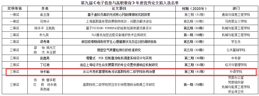 3月25日,根据《上海电子信息职业技术学院校刊年度优秀论文评选与奖励办法》,科研处组织学术委员会专家对我校教师发表在2020年《电子信息与高职教育》的论文分为自然科学、人文思政两组进行了严格评审,徐长瑜老师《从公共危机管理视角浅谈高职院校二级学院协同治理》获第九届《电子信息与高职教育》年度优秀论文三等奖,这是继校刊优秀论文评选活动以来,外院老师第四次获奖。
