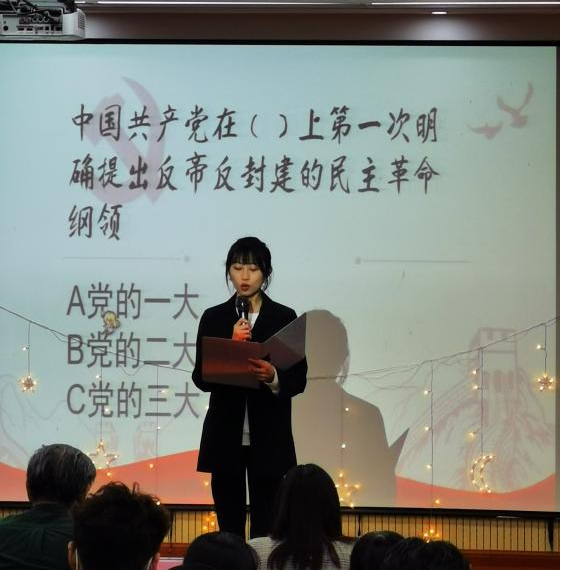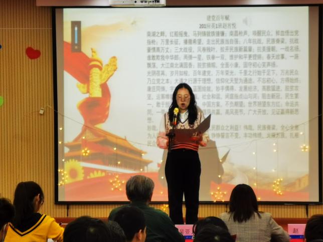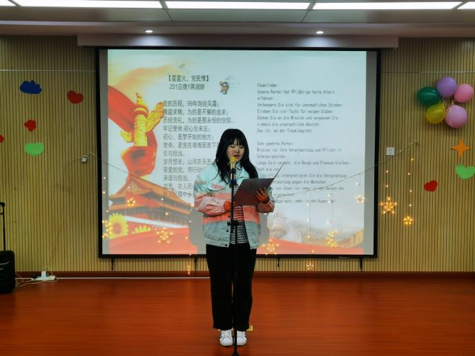 本次比赛旨在歌颂党的宏伟历史,用诗词歌赋吟诵共产党人对真理矢志不渝的追求。各组选手认真备赛,积极向上的精神面貌迎接此次比赛。比赛在深情的德语朗诵《星星火,党民情》中拉开帷幕,参赛选手以饱满的激情朗诵了《活埋》、《可爱的中国》、《换了人间》、《有的人》、《思往昔岁月,看今朝正举》等立意鲜明的诗歌,体现出当代青年对党的热爱和深情。比赛过程中还穿插了“党史有奖竞答环节”,同学踊跃参与,积极抢答,一起重温了中国共产党建党以来的光辉历程,进一步地学习了党的基本理论、基本路线、纲领以及党章知识等。