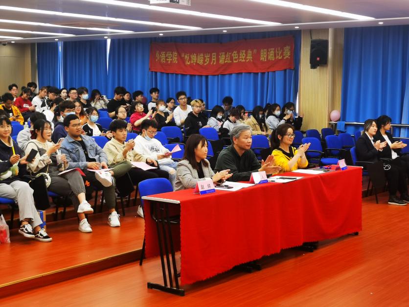 为庆祝中国共产党成立100周年,深入开展党史学习教育,引导广大团员青年学党史、强信念、跟党走,感受中国百年辉煌历史,培养学生爱党、爱国、爱社会主义的朴素情感,外语学院于4月19日在I403举行了“忆峥嵘岁月,颂红色经典”朗诵大赛。我院直属党支部书记吴亚人、团总支书记赵婷、辅导员陈丹以及曾晶老师应邀担任比赛评委。