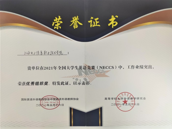 2021年5月16日,由中国英语外语教师协会(TEFL China)和高等学校大学外语教学研究会联合主办的2021年全国大学生英语竞赛(NECCS)决赛于上海宇森进修学院如期举行。由外语学院肖潇、王燕华老师指导的2020级通信与信息工程学院的陈志朗同学经层层选拔,最终荣获全国高职组(D类)一等奖,2020级外语学院朱威挺等5位同学荣获二等奖,8名同学荣获三等奖。我校获得大赛优秀组织奖。