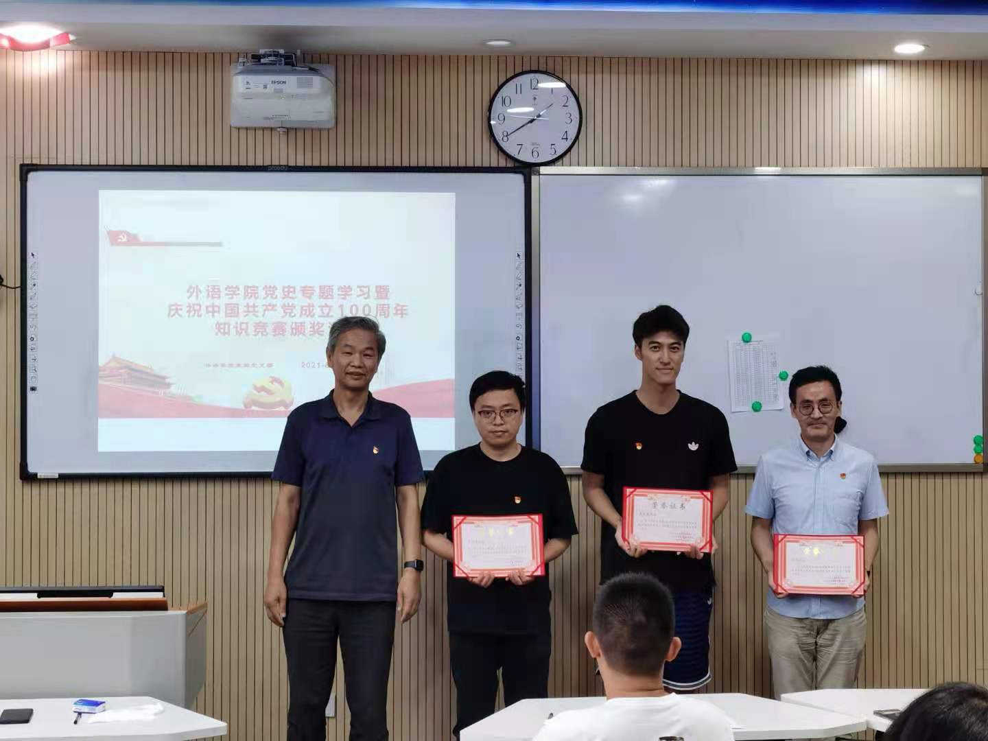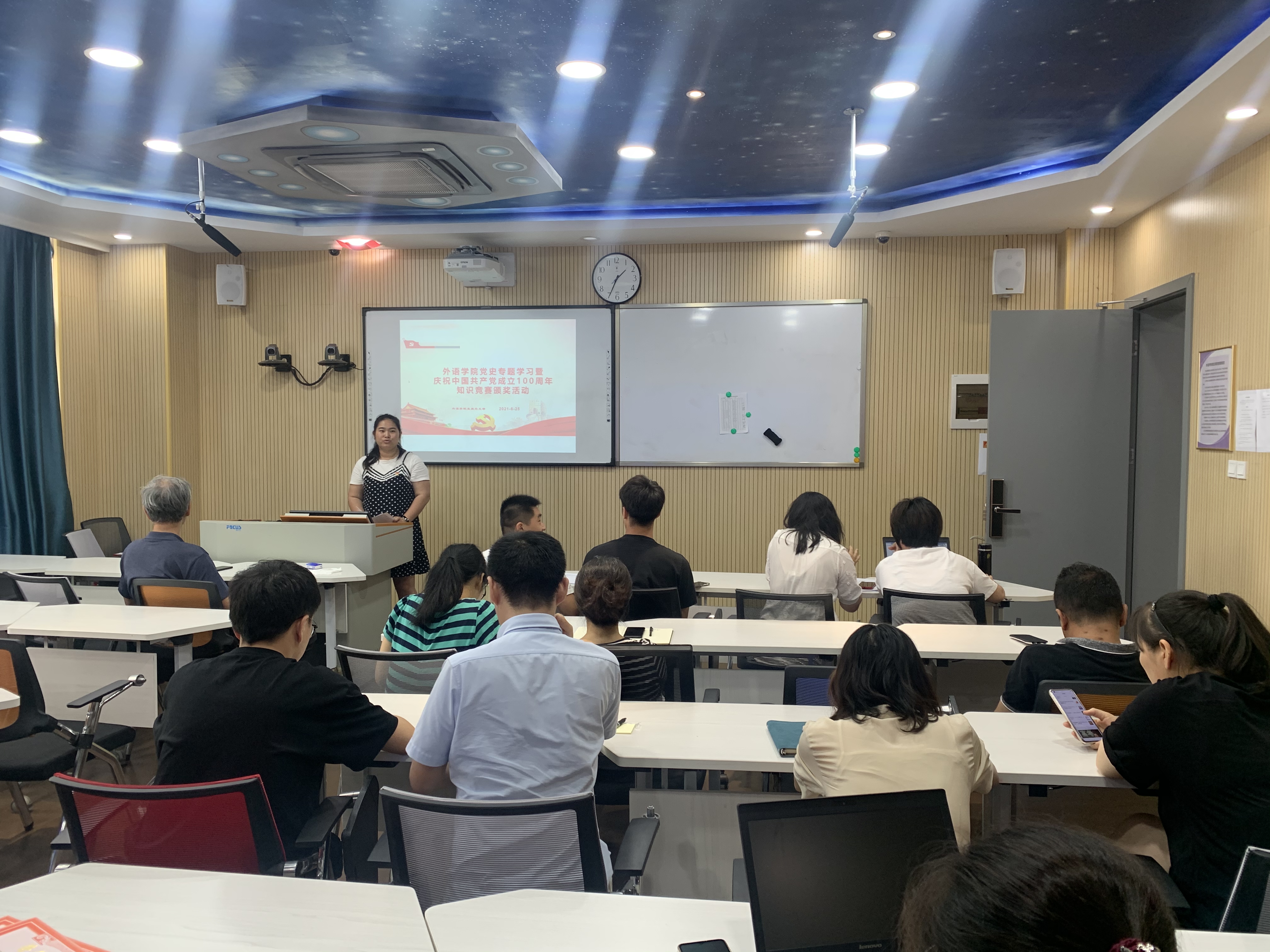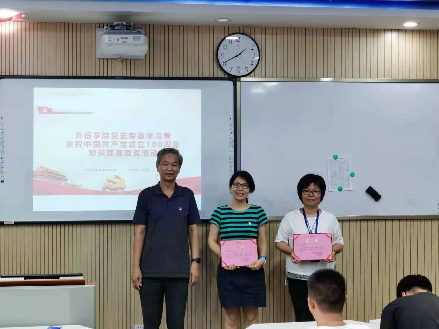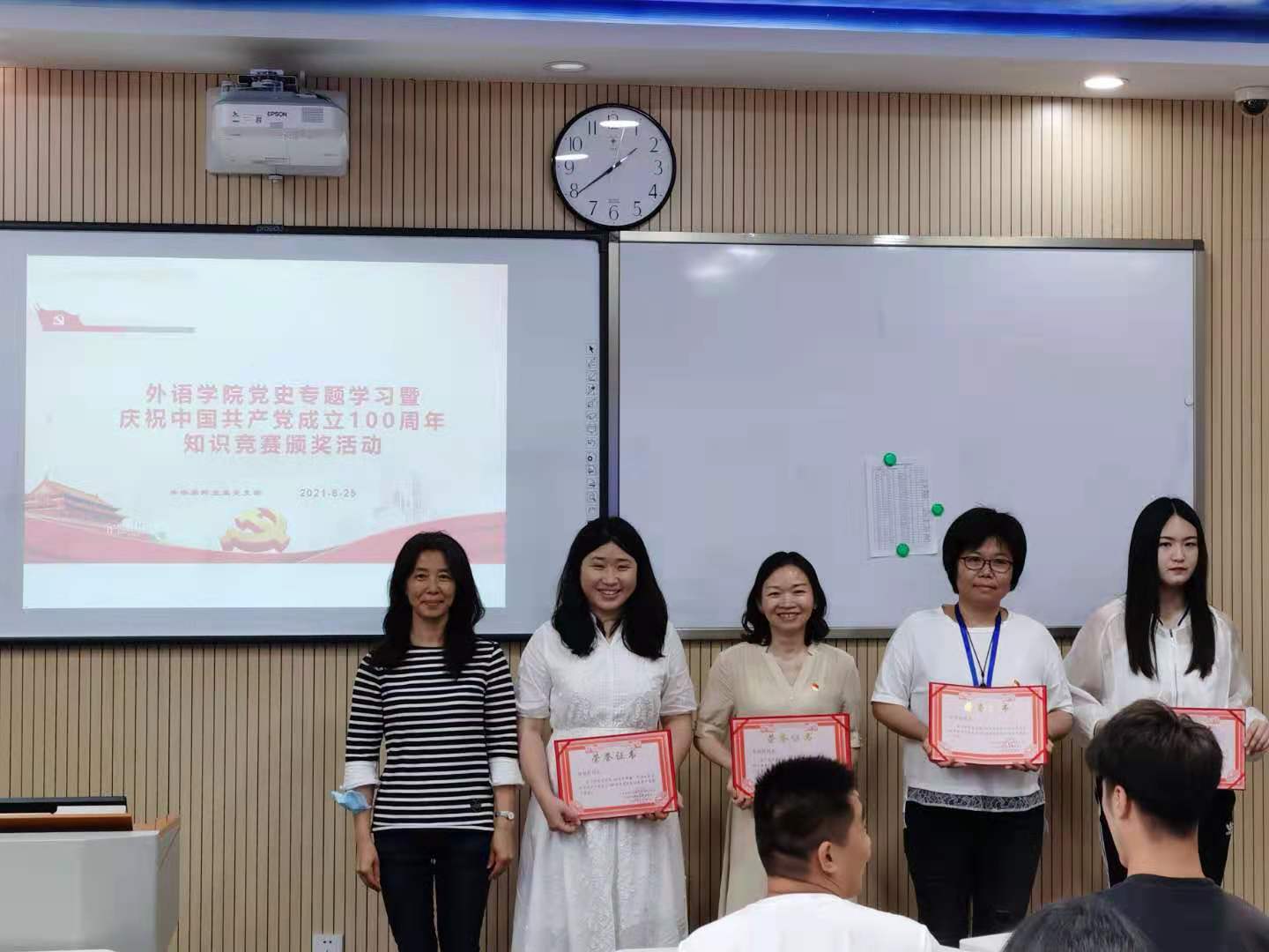 6月25日,外语学院直属党支部在A110举行党史专题学习暨庆祝中国共产党成立100周年知识竞赛颁奖活动,全体党员和入党积极分子一起参加了此次活动。