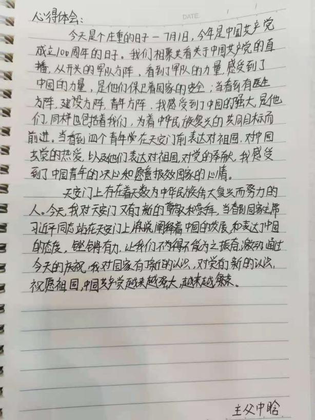 在收看庆祝大会的过程中,师生们认真做好笔记。在会后,纷纷写下自己的感受:伟大的中国共产党带领华夏儿女走过百年奋斗路,从上海石库门到嘉兴南湖,中国共产党自成立的那天起,就把“为中国人民谋幸福,为中华民族谋复兴”作为初心使命并矢志不渝地为之奋斗。在庆祝建党百年之际,我们回望历史,先烈们用热血铸就了今天的辉煌。聆听习近平主席回眸中国共产党百年征程,内心无比激动。我们要响应习近平总书记向全体中国共产党员发出的号召:牢记初心使命,坚定理想信念,践行党的宗旨,永远保持同人民群众的血肉联系,始终同人民想在一起,干在一起,风雨同舟,同甘共苦,继续为实现人民对美好生活的向往不懈努力,努力为党和人民争取更大光荣!