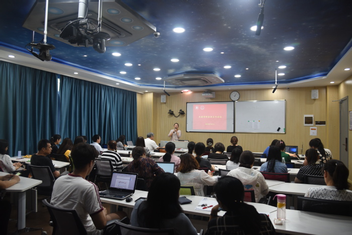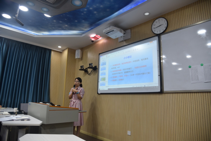 ESP教研室主任陈婷华对十三五期间学院科研情况进行总结、包括总分、完成率、完成度。新版科研考核规定中相关政策变化。并提出了新时期学院科研工作总体攻克目标,要实现“高水平论文多发表、高层次项目多立项、教师个人“零”分突破”。并提出要整合资源、紧抓科研团队,促进学科交叉融合,完善科研合作机制、构建“学科融合、产学研、外语+”的多融合之路,营造浓厚学术氛围,带动青年教师的十四五发展目标。