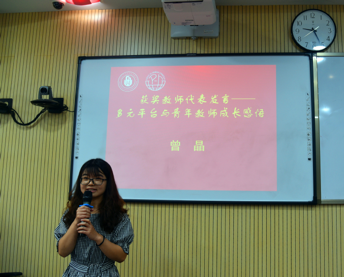 会上,各领域获奖代表分别发言。德语系何湘老师从本次高教社微课大赛介绍了个人参赛和感悟,表示参赛不以获奖为绝对目的,享受备赛的过程、放平心态,本着学习和成长,这才是教师奋斗中最美的体验。英语系曾晶老师分享了个人入职两年来在教学、科研、大赛等各方面的成长和体会,与其他年轻老师共勉成长中应当多尝试、多接触、勤学习的必要性。李聪莉老师以“科研源于教学实践、科研成果又反哺于教学实践”为题做了个人一年来科研经验的介绍。从选题新颖紧扣政策到发表论文期刊应跟踪目标期刊,分析用稿倾向针对性投稿等个人宝贵经验。李俊霞老师分享从教的缘起、乐趣和感悟。与在场所有教师共同回顾从教初心和使命。她提到为师者应当 “具有高尚共产主义情操之“人”, “立德树人之“师”,严谨治学,长学不辍,从“为人为师为学”各方面严格要求自己,不断成长。