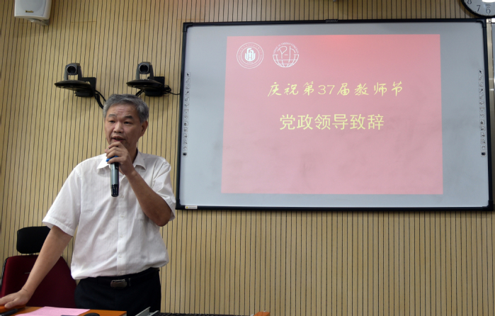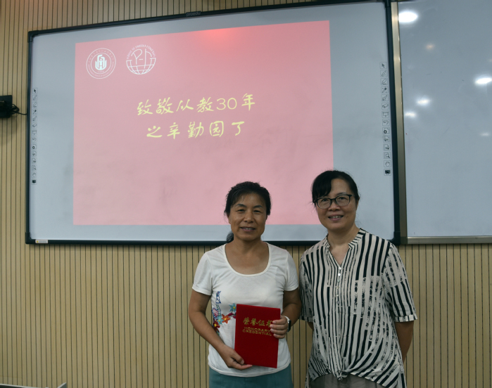 肖潇院长为大会致开幕词。陈婷华老师宣读了学院教师节表彰名单,本次获奖涵盖特殊贡献与突破、教学质量工程(教学技能大赛)、教学质量工程(学生竞赛指导)、科研与产教融合探索奖等四大类。全院约80%的教职工均在不同领域有所收获。党支部书记吴亚人、院长肖潇、副院长邓玉华、支部支委陈婷华为获奖教职工代表颁了奖。大会还增设了特殊环节,由学院老教师陈燕为今年恰满30年教龄的李俊霞老师颁发“致敬从教30年之辛勤园丁奖”。