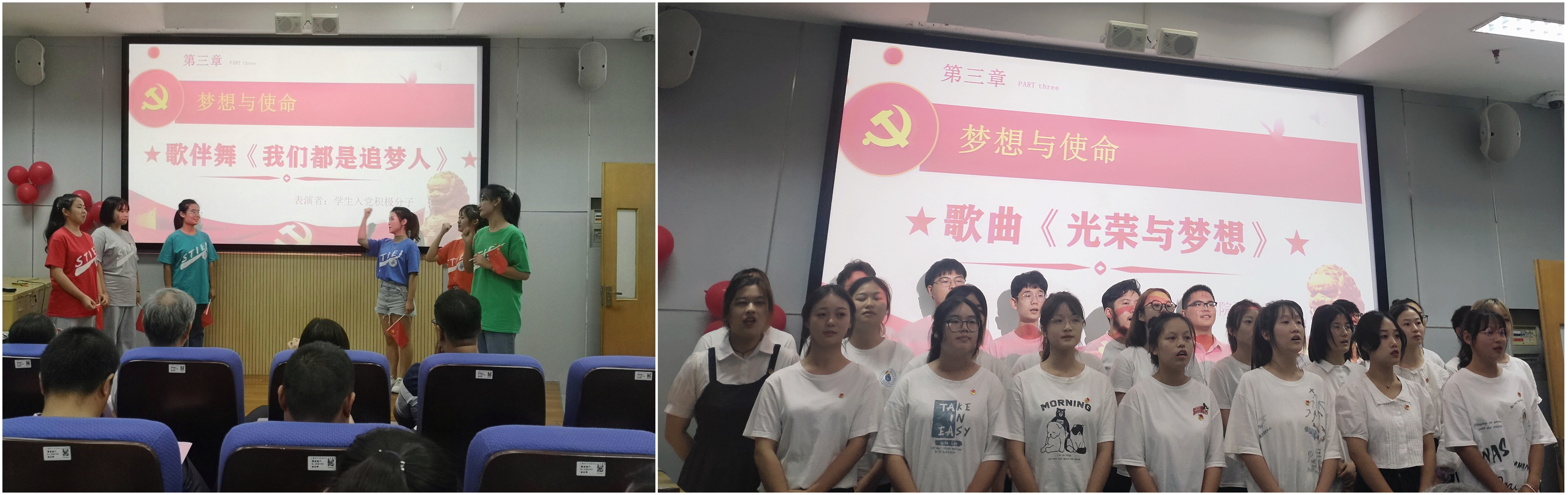 前赴后继的中华儿女满怀对祖国和人民的赤子之心,积极投身党领导的革命、建设、改革伟大事业,为人民战斗、为祖国献身、为幸福生活奋斗,谱写了一曲又一曲壮丽之歌。一代人有一代人的使命,外语学院青年团员代表们跳起《我们都是追梦人》,唱着《光荣与梦想》,向着实现中华民族的伟大复兴前进。