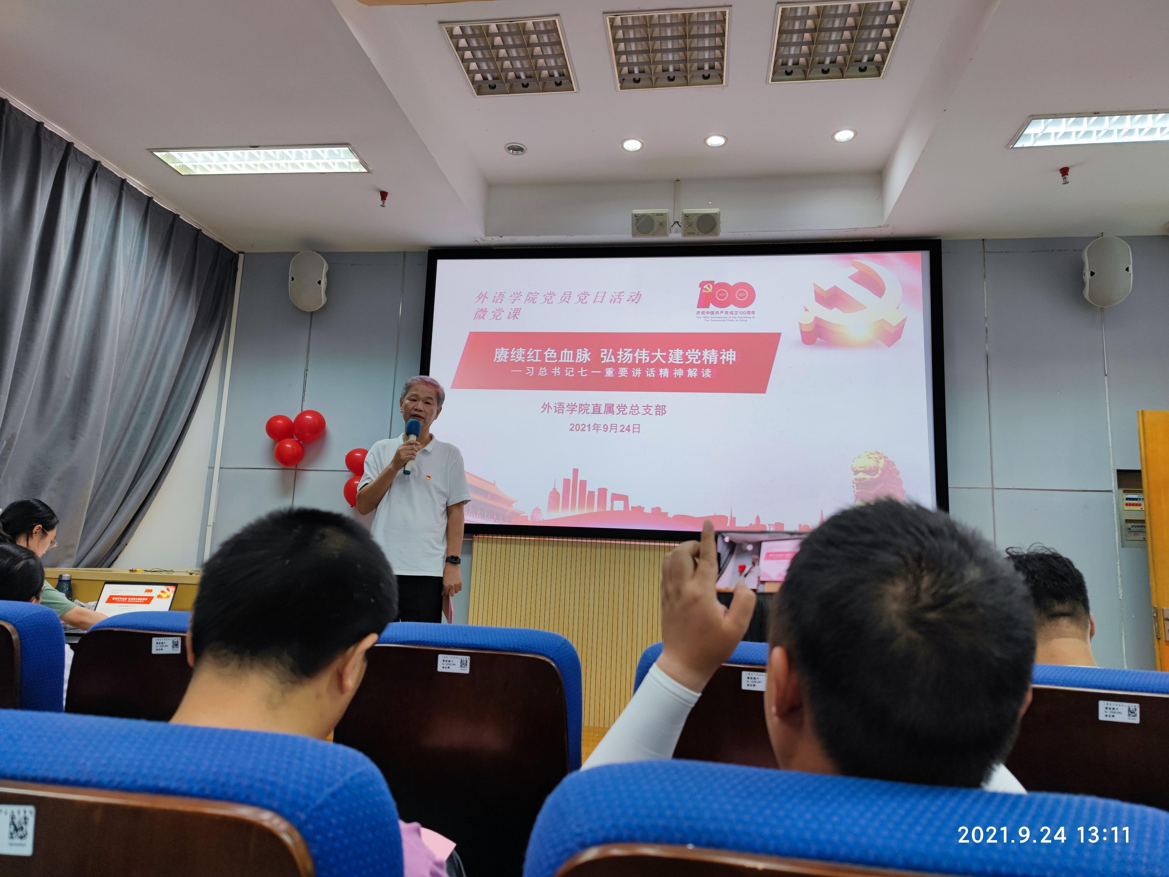 学党史,担使命。建党的开天辟地,到新中国成立的改天换地,到改革开放的翻天覆地,再到十八大以来党和国家事业取得历史性成就、发生历史性变革,中国共产党带领中国人民砥砺奋进,从胜利走向胜利。外语学院直属党支部书记吴亚人老师讲授微党课《赓续红色血脉弘扬伟大建党精神——学习习总书记七一讲话精神》,分享了学习总书记七一讲话精神体会,回顾了党的百年辉煌历史,要求全体党员传承和弘扬伟大的建党精神,谨遵习总书记的教导,弘扬伟大建党精神,始终做到对党忠诚、不负人民。自觉践行“两个维护”,牢固树立“四个意识”和“四个自信”,坚决贯彻执行党的群众路线,着力解决人民群众急难愁盼问题,坚决不负党和人民的殷切希望。