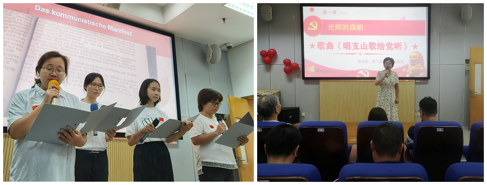 没有共产党就没有新中国。回望历史,1840年鸦片战争以后,中国逐步成为半殖民地半封建社会,国家蒙辱、人民蒙难、文明蒙尘,中华民族遭受了前所未有的劫难。2021年中国共产党在上海成立,就像一面光辉的旗帜带领中华民族实现了从几千年封建专制政治到人民民主的伟大飞跃,实现了由不断衰落到根本扭转命运、持续走向繁荣富强的伟大飞跃,中国人民迎来了从站起来、富起来到强起来的伟大飞跃。党员同志们通过唱红歌、诗朗诵以及学生歌舞等形式,歌颂了党的伟大。党员同志们用中、德、英、俄四国语言诵读了《共产党宣言》,追溯了党的初心使命;《唱支山歌给党听》,唱出永远知党情、感党恩、跟党走的心声。