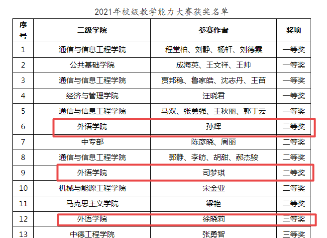 2021年度校级教师教学能力大赛,外语学院教师暂获佳绩。孙辉、司梦琪分别获二等奖,徐晓莉获三等奖。