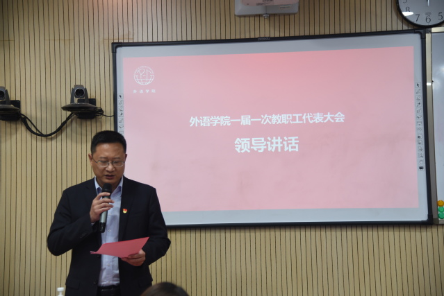 本次教职工大会得到了学校党委、学校工会以及兄弟院系的关心和支持。校党委副书记、副校长、校工会主席张涛、校工会常务副主席邵菁、马克思主义学院直属党支部副江龙出席了11月19日的开幕式,并做工作指导和交流。张涛副书记要求:开好教职工大会是学校政治生活中的一件大事,更是各二级学院做好民主管理工作中的一件大事,加强工会工作是加强党的执政能力建设的重要内容,工会组织要做好广大教职工利益的代表者和维护者。外语学院分工会要在校党委和工会的领导下,一如既往履行工会职能、维护广大教职工合法权益,团结和依靠广大教职工,不忘初心,凝心聚力,努力开创学院教育事业发展新局面,用优异的成绩向学校职业本科建设献礼。
