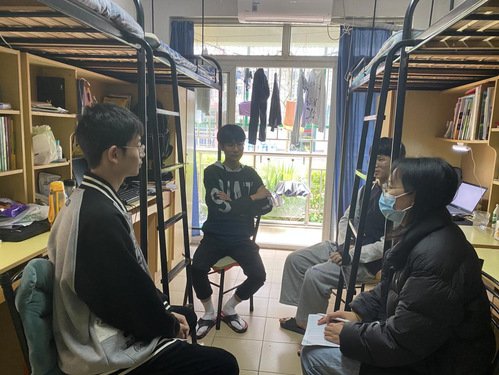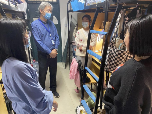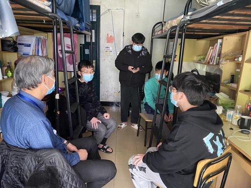 在走访过程中,吴亚人老师与同学们亲切交谈,询问同学们线上学习情况和生活情况,现场为同学们答疑解惑,提醒学生做好个人防护,牢记“三件套”“五还要”,鼓励同学们学会调整心态、互相体谅、互帮互助,共克时艰。