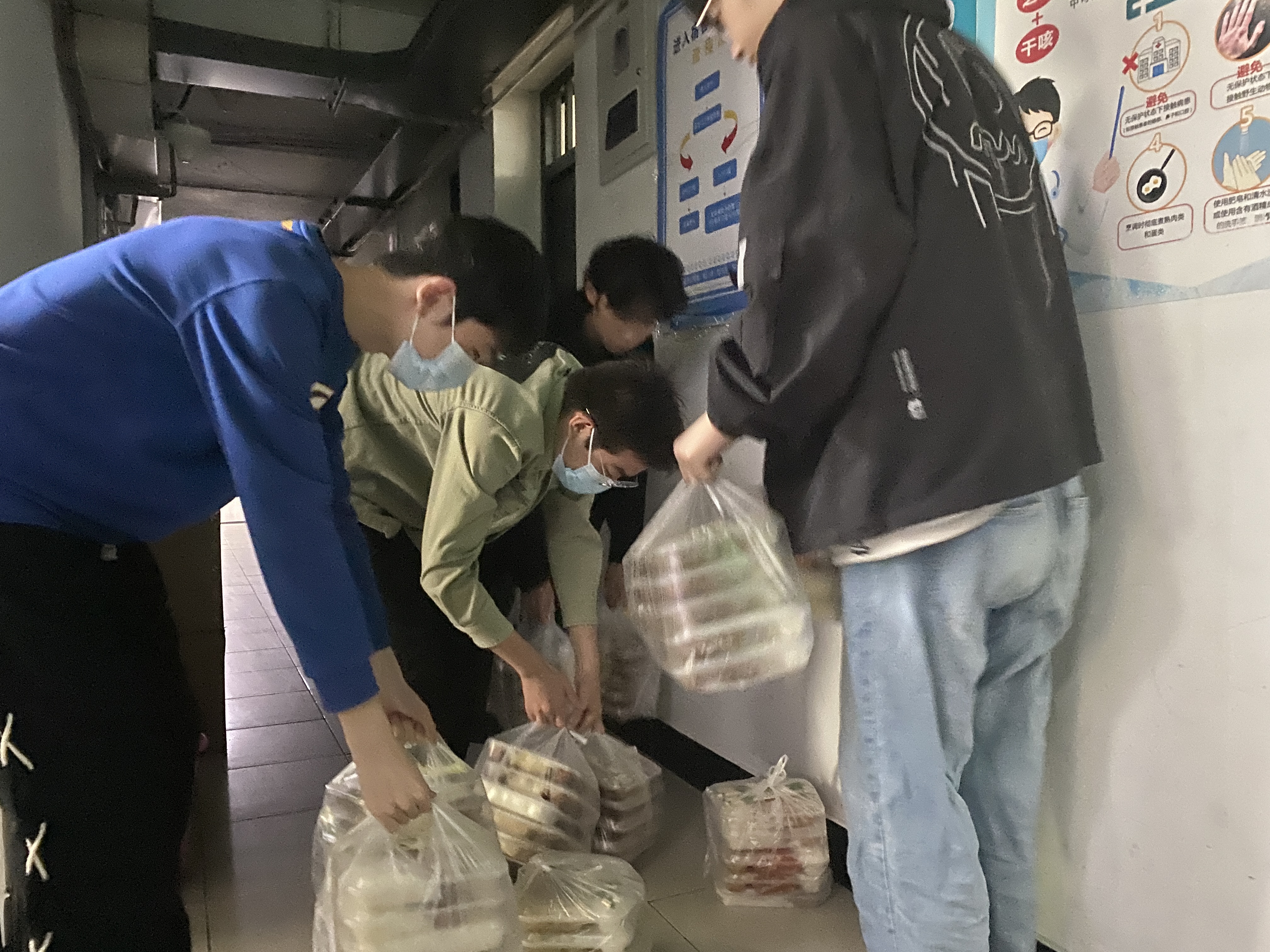 “志愿者们,起床了,来一楼领早饭和抗原试剂了”“志愿者们,中午饭时间到了,来为同学们发放午饭了”……