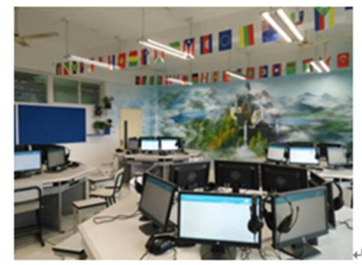 使用面积96平方米,配备带有高保真耳机的电脑65台,每台机器安装实用英语实训平台,供学生备考实训;机位间间距合理,两机位间设置隔板,听说训练时可防干扰;有良好的网络环境,可供学生上网查阅学习资源;有监控设备和应急指挥终端,可有效防止学生考试作弊等。工位数:32。