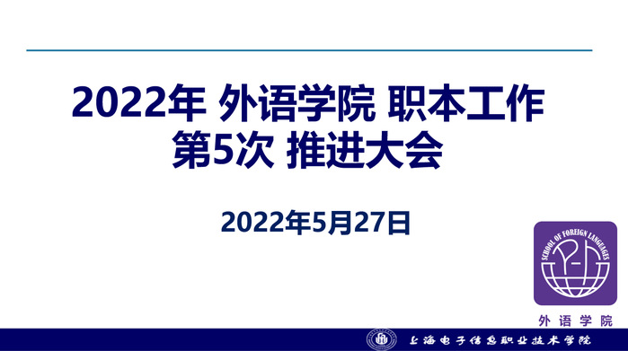 5月27日下午,外语学院全体教职工在线召开2022年职本工作第五次推进大会,会议由外语学院院长肖潇主持。大会传达了5月以来学院职本工作中关于高层次人才引进、专业教师企业实践、横向技术服务等指标进展情况,并为全院教职工讲解了职本目标对标、2022年度部门考核指标,强调下阶段工作指导思想与原则:两个对标;指标与达标,指标权重与考核奖励,工作重点与成果导向。通过各项指标的解读,并且要求全体教职工明确当前工作重点,围绕学院核心和指标建设开展工作。