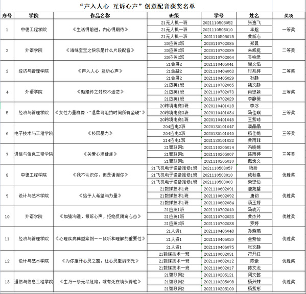 本次配音活动的开展,既正面宣传大学生心理健康知识,让同学们了解心理健康的重要性,同时也为喜欢配音创造的同学们提供了展示自我的平台,锻炼了学生的语言实践能力,引导学生们关注心理成长,热爱生活,关爱自我。(供稿:外语学院学生管理办公室)