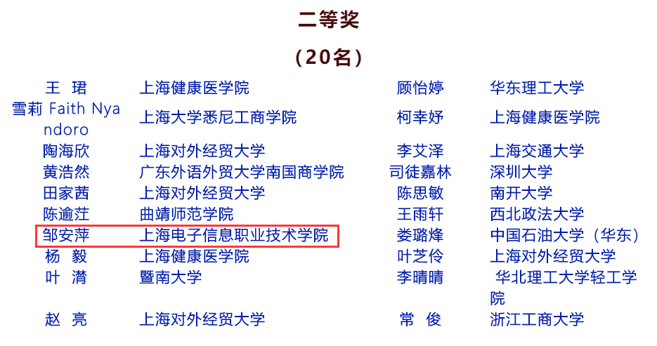 该赛事旨在培养我国大学生扎实的英语语言基础、跨学科知识和人文科学知识,培养具备各领域国际交流能力、能够讲好中国故事的高素质复合型人才。大赛分征文和现场(线上)展示两个环节。全国近80所高校的500余名本科生、研究生以及部分社会人士和留学生等参加了比赛。经过评委严格评审,最后仅30名选手进入决赛。在徐晓莉老师的悉心指导下,邹安萍一路过关斩将,脱颖而出,获得佳绩。她是获奖选手中唯一的一位高职院校学生。