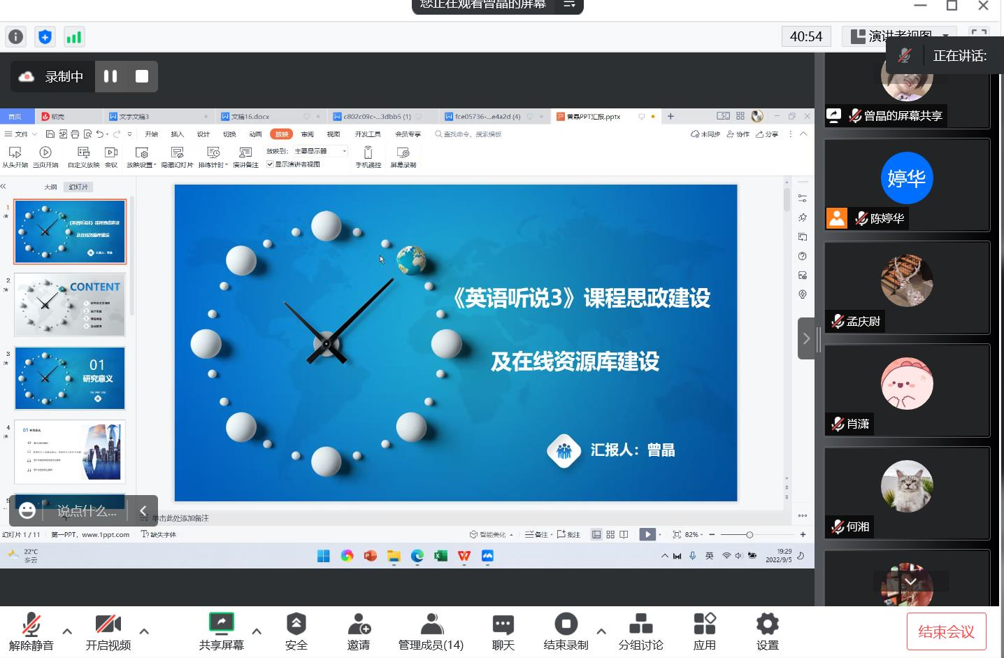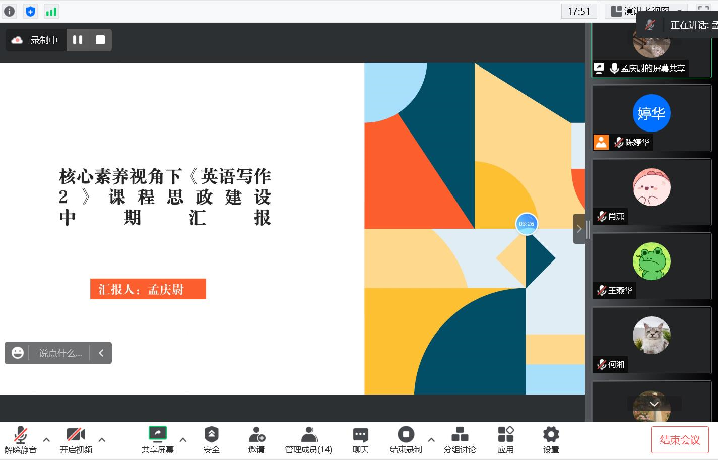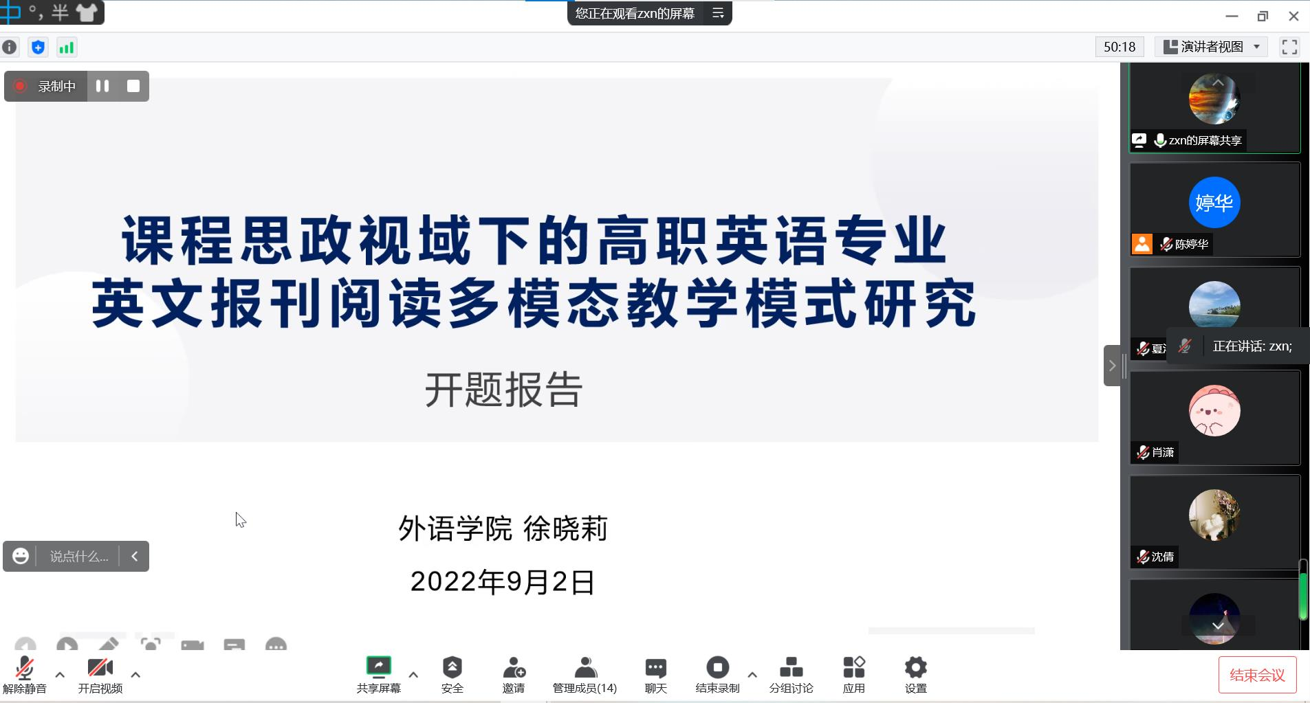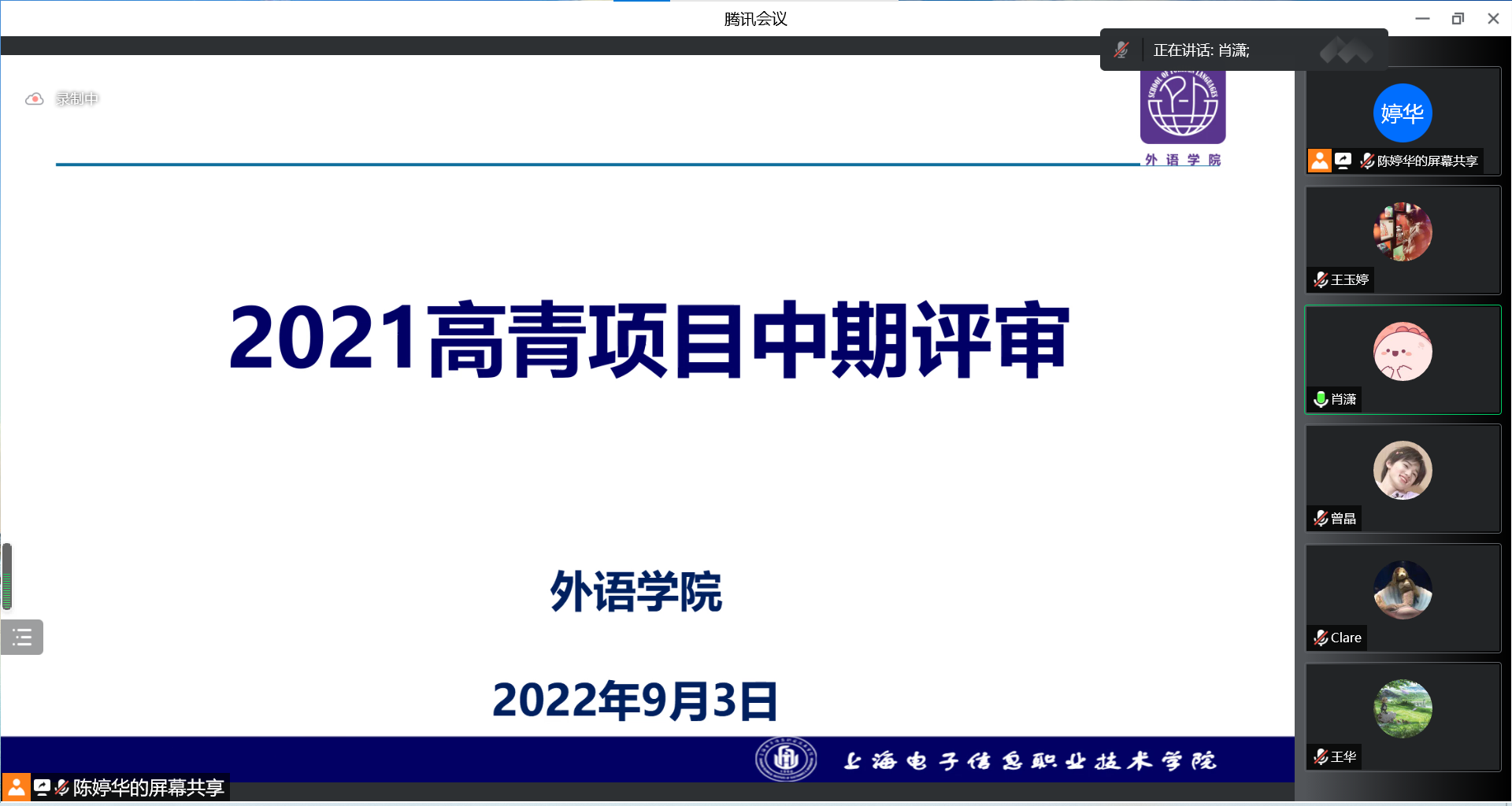 外语学院于九月二、三日组织专家通过腾讯会议平台对学院2022年校级课题开题和2021年高青课题中期进行了评审,评审会由外语学院科研秘书陈婷华主持,各项目负责人对项目开展情况作了汇报。专家们对汇报内容进行了细致的点评,并给出了切实可行的改善建议。肖潇院长给大家分享了外语教学发展最新动态,同时也提出了明确的工作要求,希望大家多做调研,多积累材料和经验,为申报更高层次的课题做好准备工作。(作者:陈婷华)
