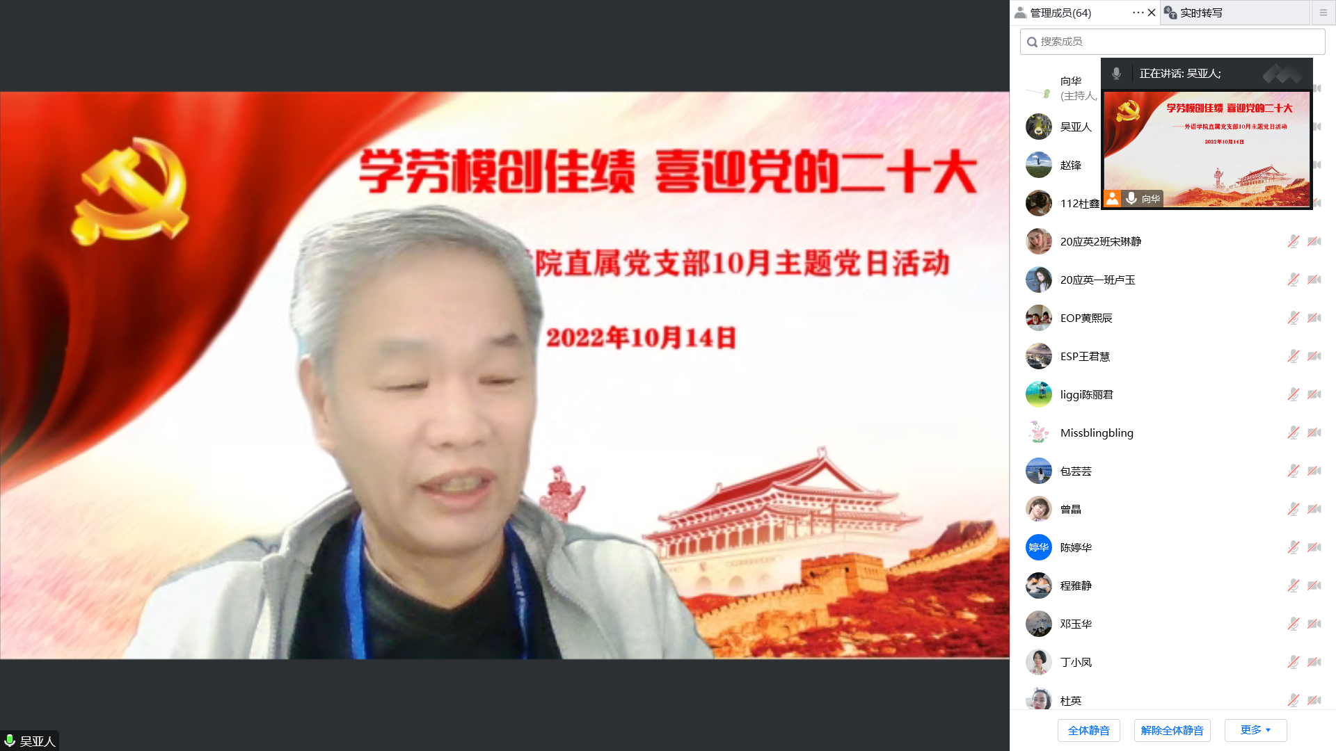 1014日,外语学院直属党支部通过腾讯会议在线举行“学习劳模精神 喜迎党的二十大”主题党日活动。党支部邀请2010—2014年度上海市劳动模范荣誉称号获得者,上海新华传媒连锁有限公司销售中心副总经理兼上海书城总经理“传承匠心 坚守初心——做新时代奋斗者”主题报告,并和师生进行了亲切交流。活动由党支部书记吴亚人主持,党支部30名党员和22名入党积极分子参会,学院部分教职工聆听了讲座。
