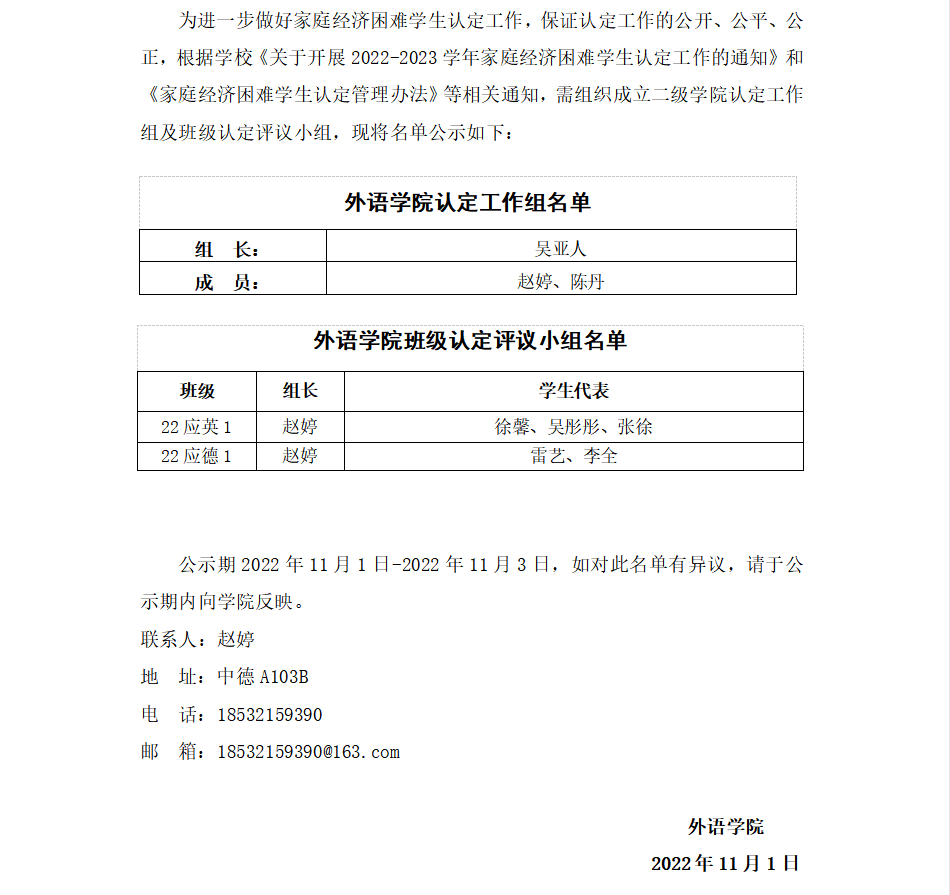 外语学院2022-2023学年外语学院认定工作组、班级认定评议小组成员名单公示(22级)
