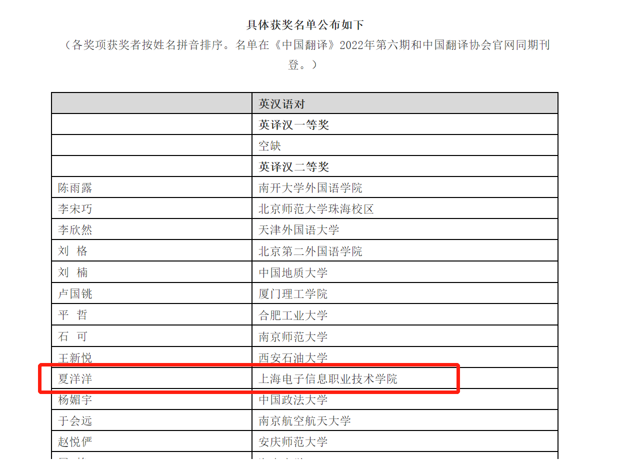 近日,第三十四届韩素音国际翻译大赛获奖名单揭晓,我院夏洋洋老师在英译汉项目中荣获二等奖佳绩。韩素音国际翻译大赛于1989年创办,是中国翻译界组织时间最长、规模最大、最具权威性的翻译大赛,受到广大青年翻译爱好者的欢迎。本届大赛由中国翻译协会、中国翻译研究院与天津外国语大学联合主办,教育部中外语言交流合作中心支持,《中国翻译》编辑部与天津外国语大学高级翻译学院联合承办。大赛在32999份参赛译文中评选出获奖者982名,其中英译汉项目一等奖空缺、二等奖15名、三等奖33名、优秀奖285名。