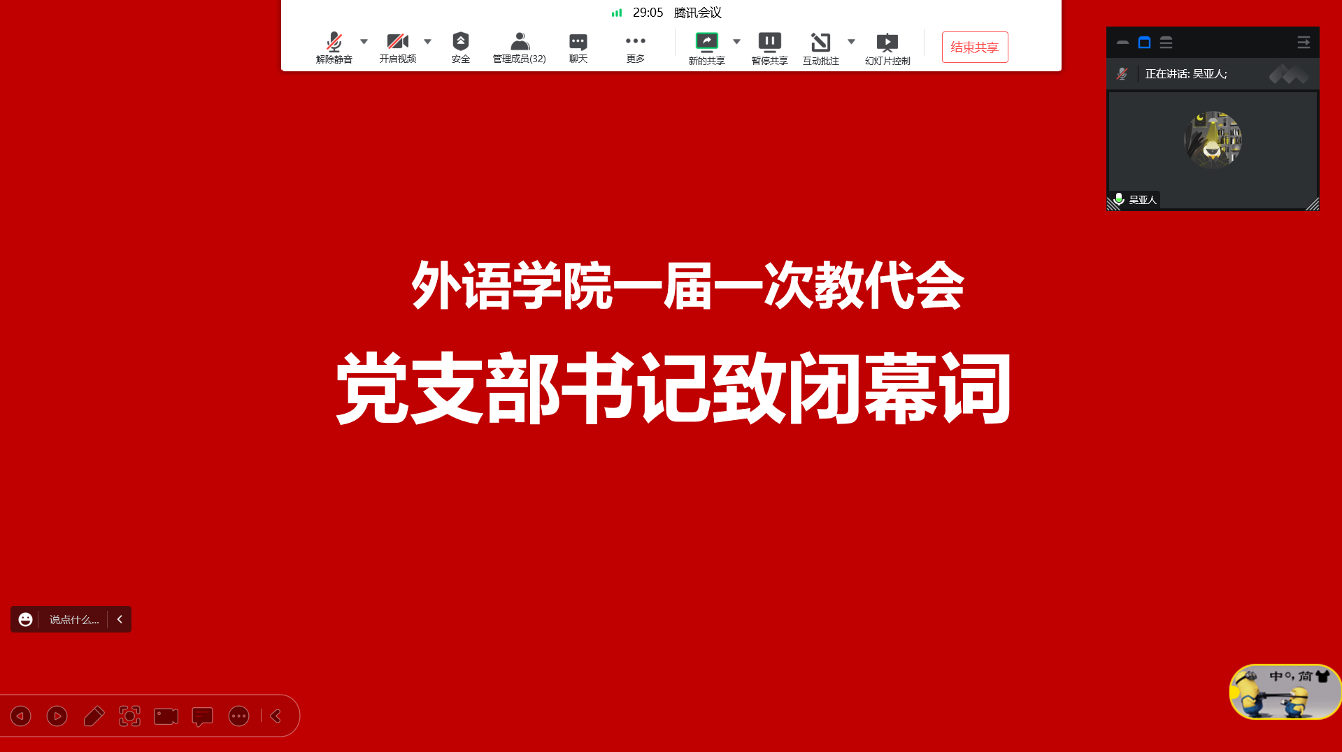 在深入学习贯彻党的二十大精神之际,外语学院一届一次教职工代表大会于12月31日在线上顺利召开。会议由外语学院工会主席向华主持,学院32名教代表和列席代表齐聚云端参会。