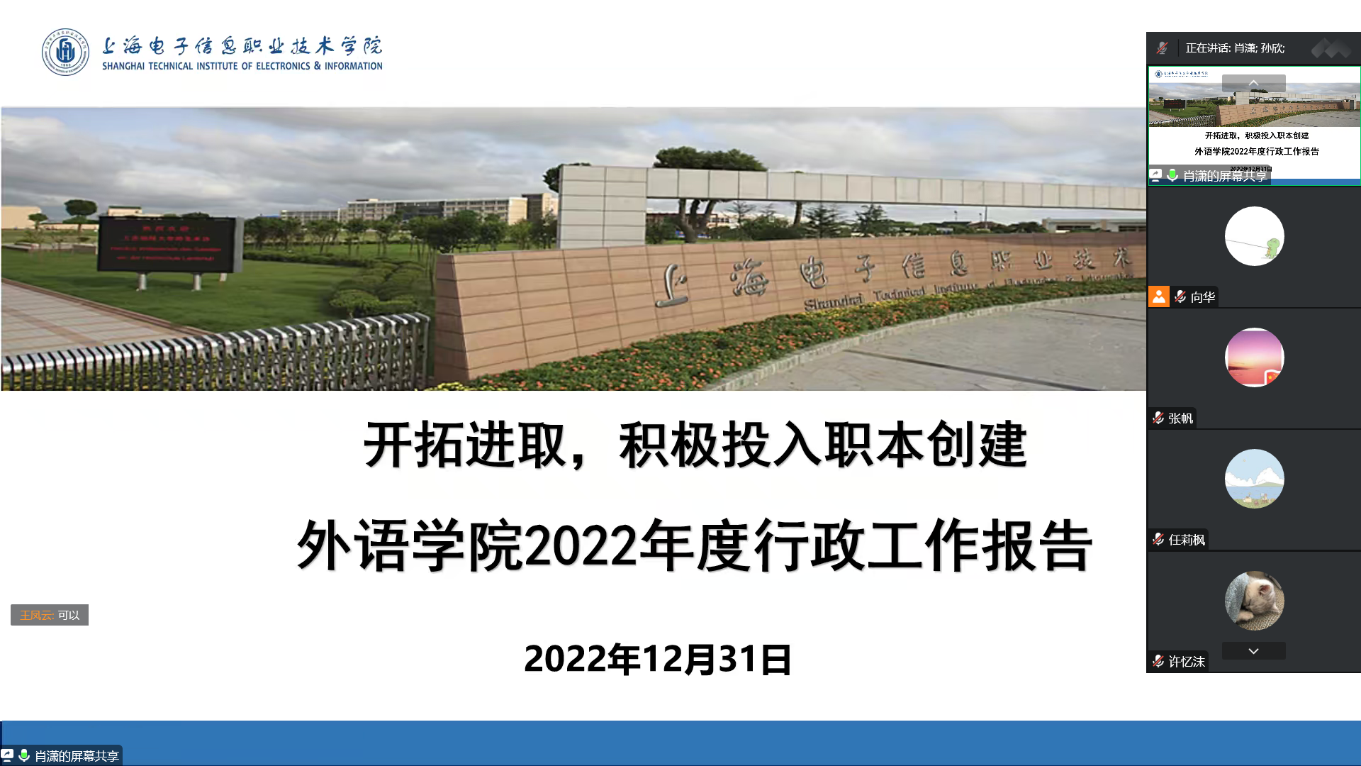 大会在庄严的国歌声中正式开幕。外语学院肖潇院长作《开拓进去,积极投入职本创建——外语学院2022年行政工作报告》。报告全面展示了外语学院在学校党委领导下坚持党建引领,保障学院各项事业稳步发展,积极打造打造特色亮点,赋能“三教改革”等方面的工作成效,并从继续深学笃行党的二十大精神,以临港产业为依托,推动产教融合发展,紧密结合现代信息技术需求优化专业设置,发展和扩大公共英语学科影响力,探索国际语言服务实践路径等方面对学院2023年工作进行了规划。