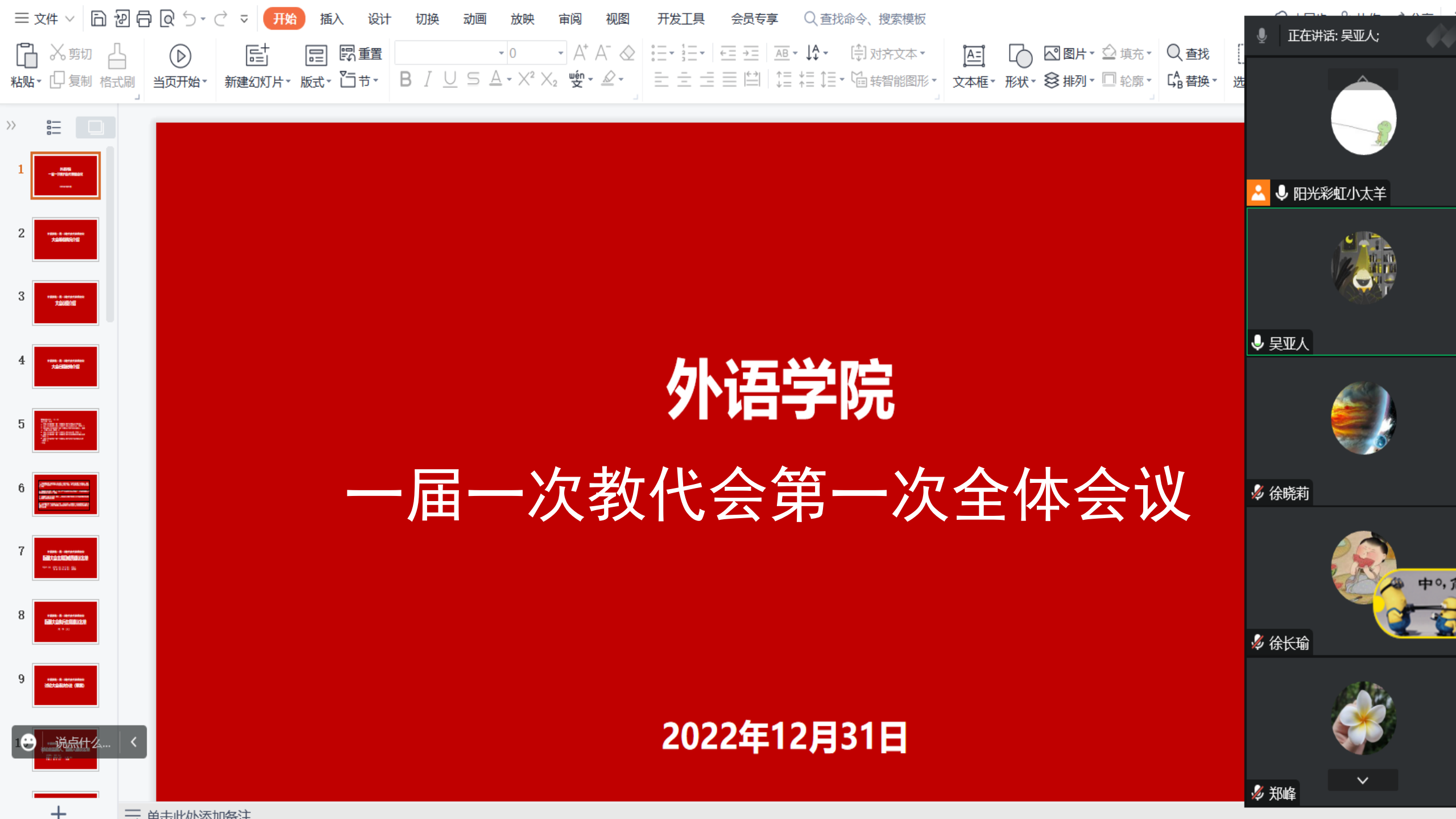 在深入学习贯彻党的二十大精神之际,外语学院一届一次教职工代表大会于12月31日在线上顺利召开。会议由外语学院工会主席向华主持,学院32名教代表和列席代表齐聚云端参会。