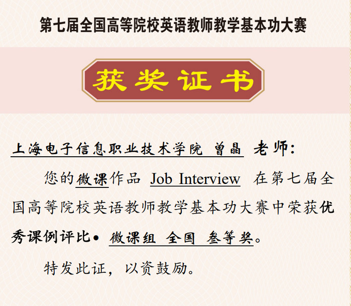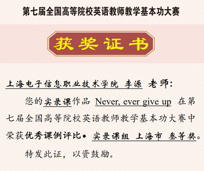 近日,第七届全国高等院校英语教师教学基本功大赛评选工作圆满落幕。我校外语学院曾晶老师荣获微课组全国三等奖,李源老师荣获实录课组上海三等奖。
