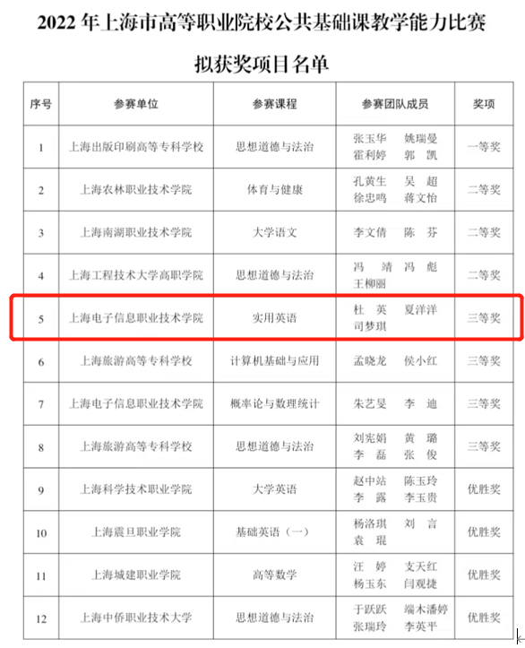近日中, 由上海市教育委员会职业教育处、上海市高职高专课程思政文化素养教育教学指导委员会主办的上海市高等职业院校公共基础课教学能力比赛圆满结束,通过网络初赛,共12组进入决赛。决赛采取线上教学展示和答辩方式,考察展示各教学团队的教学能力。我院《实用英语》教学团队杜英、夏洋洋和司梦琪三位老师在决赛中荣获大赛三等奖的荣誉,充分展示了外语学院教师的风采和水平,反映了外语学院高度重视高素质教师队伍的培养、不断夯实提升教学水平,落实提高人才培养质量。(供稿:教学管理办公室)